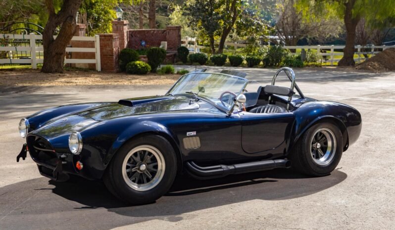 This Shelby Cobra is an aluminum-bodied CSX4000 continuation model that was purchased as a rolling chassis and assembled by Sanderson Sales and Marketing in 2004. Finished in dark blue metallic over black leather upholstery, the car is powered by a Shelby-built 510ci V8 paired with a four-speed manual transmission. Additional equipment includes a roll hoop, side-exit exhaust pipes, 15″ Halibrand-style wheels, four-wheel disc brakes, latch-and-link lap belts, a wood-rimmed steering wheel, and Smiths instrumentation.