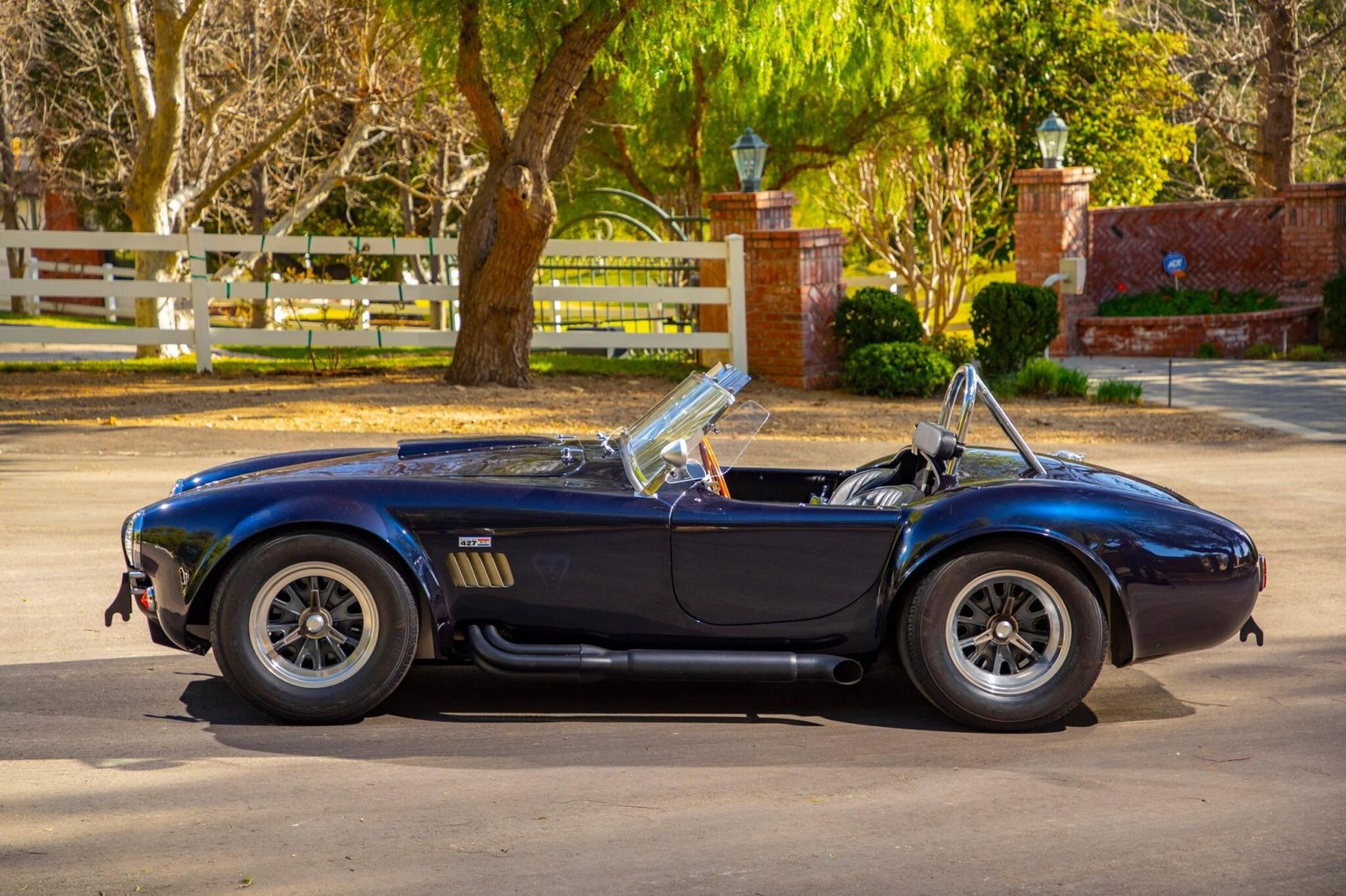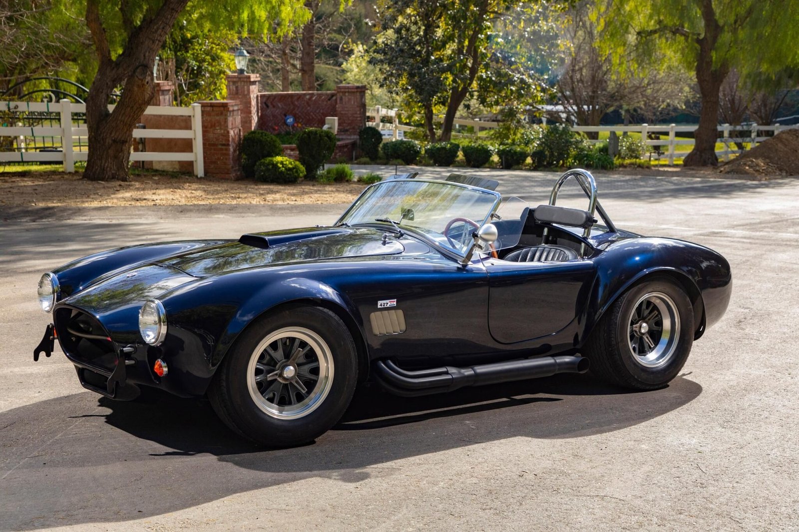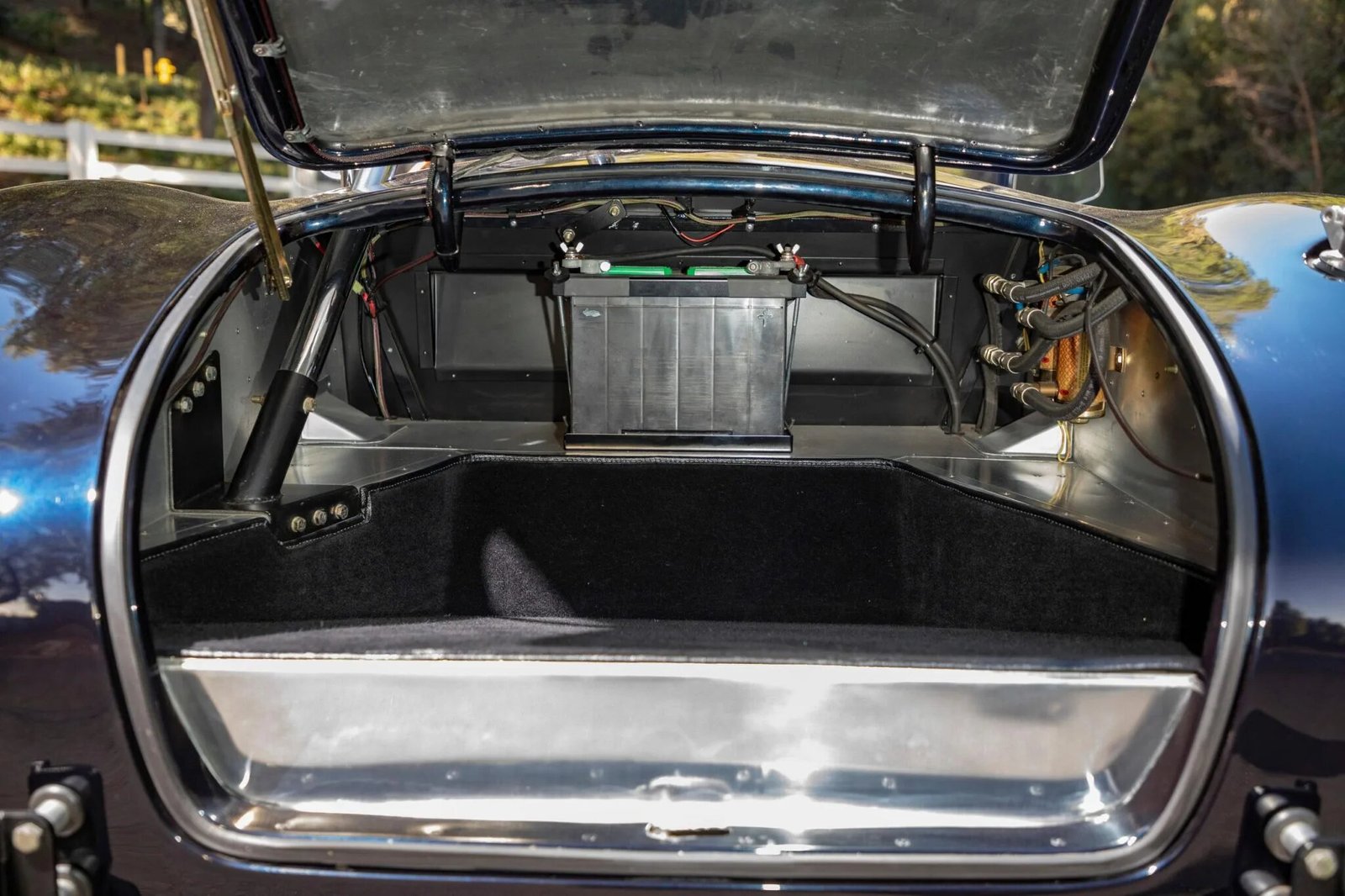 The aluminum bodywork is finished in dark blue metallic and is ne of two Sanderson Sales “Phantom Cobra” models built, which featured custom graphics along with Carroll Shelby’s name embedded in the paint.