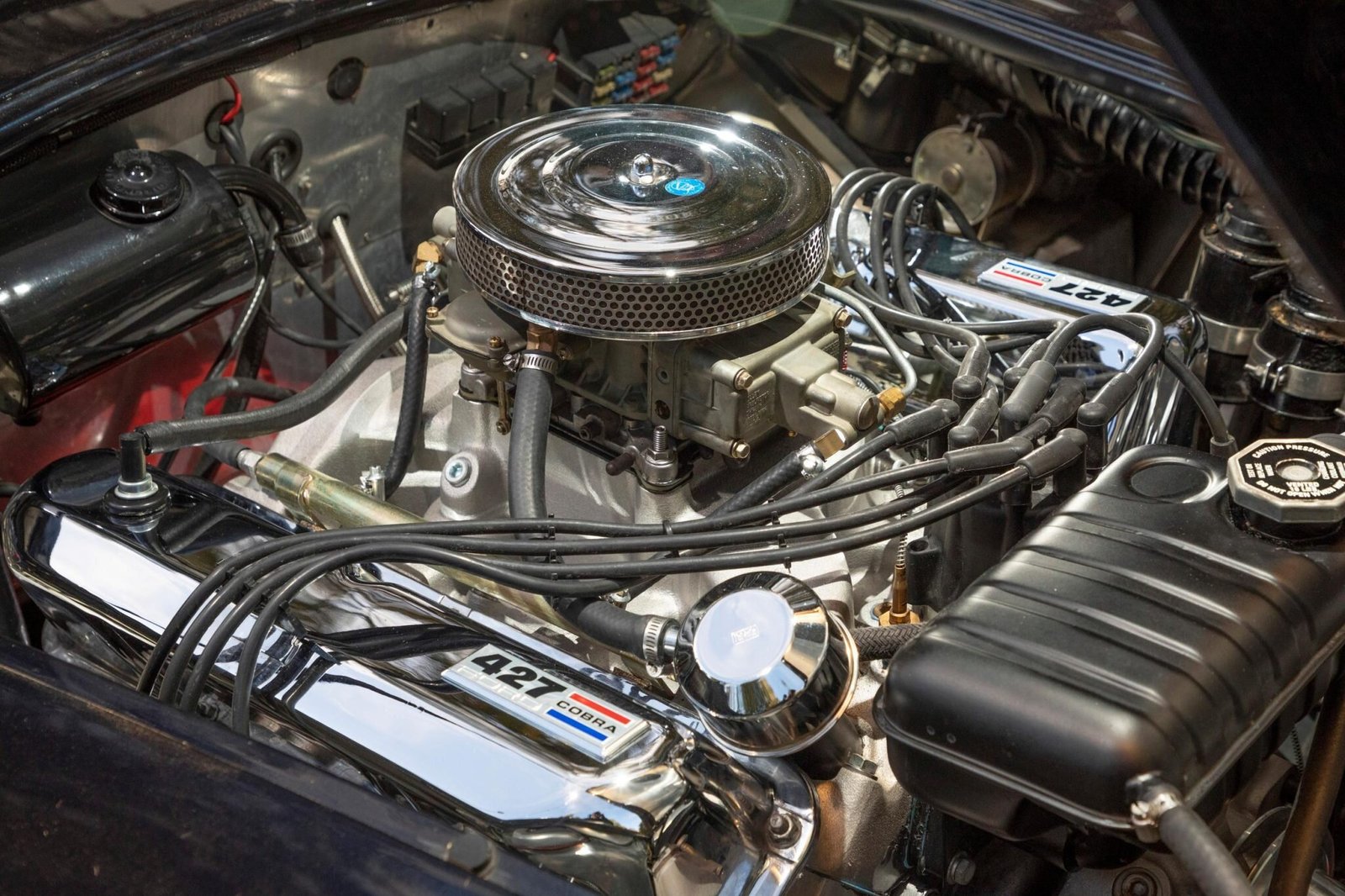The Shelby-built side-oiler V8 displace 510ci and features a single Holley carburetor, an aluminum radiator, a polished air cleaner, and 427-branded valve covers.