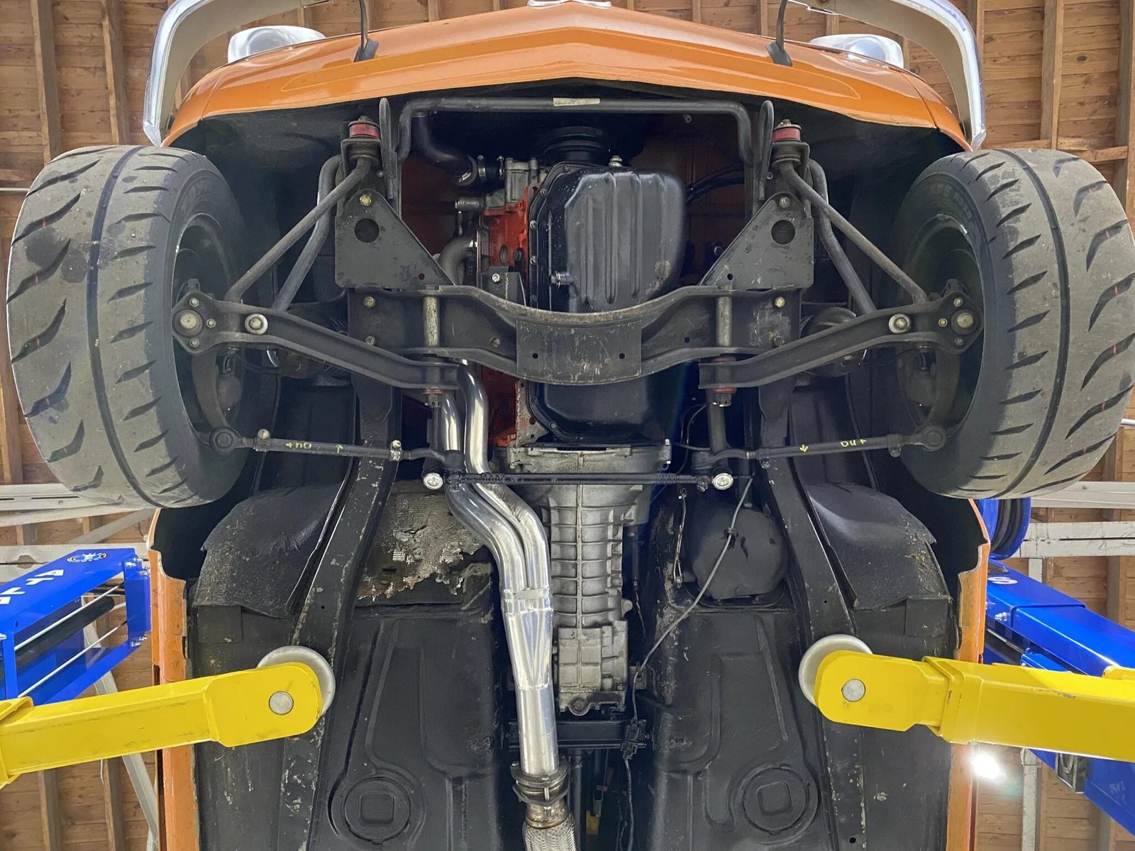 A 2002 rear subframe is fitted, and the underside and wheel wells were refinished with a protective undercoating during the car’s 2000 repaint.