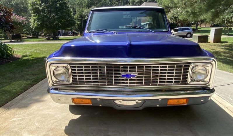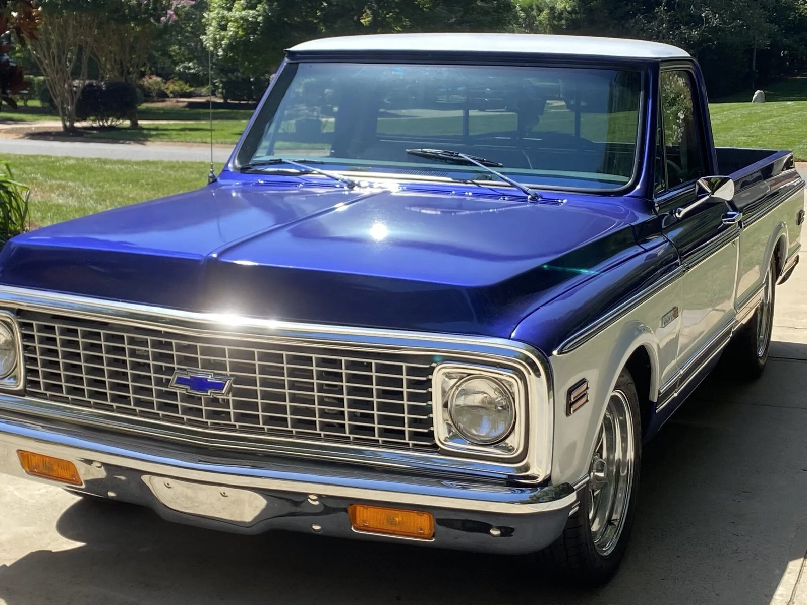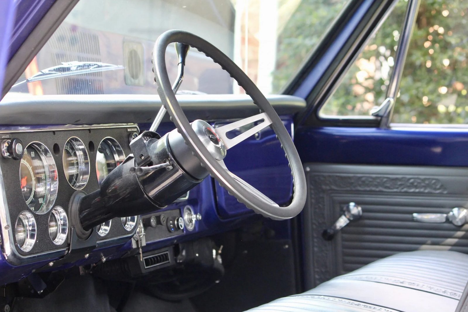 This 1971 Chevrolet C10 pickup received a body-off refurbishment in 2020 that included a repaint in blue and white over a refreshed gray interior. A replacement 350ci V8 was installed at the time of the repaint and is paired with a StreetFighter 700R4 automatic transmission.