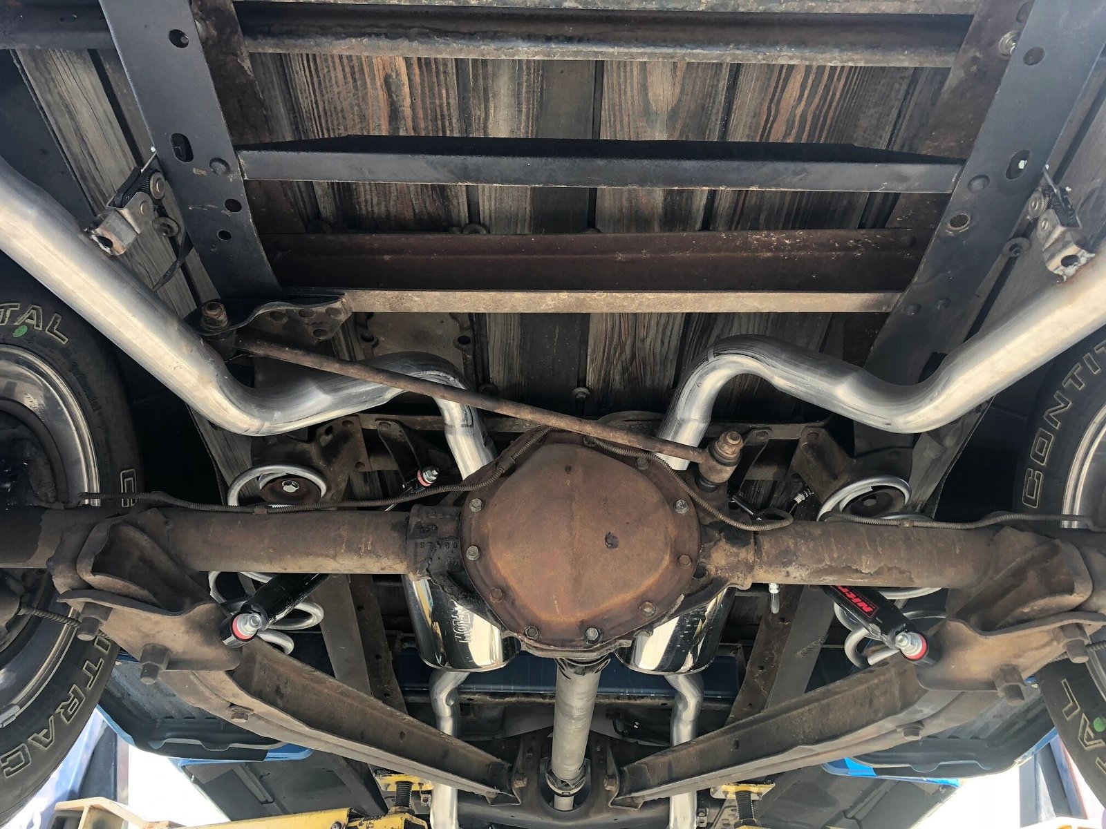 The ride height has been lowered approximately 4″ out back and 2″ up front using a Belltech suspension kit with Nitro drop shocks.