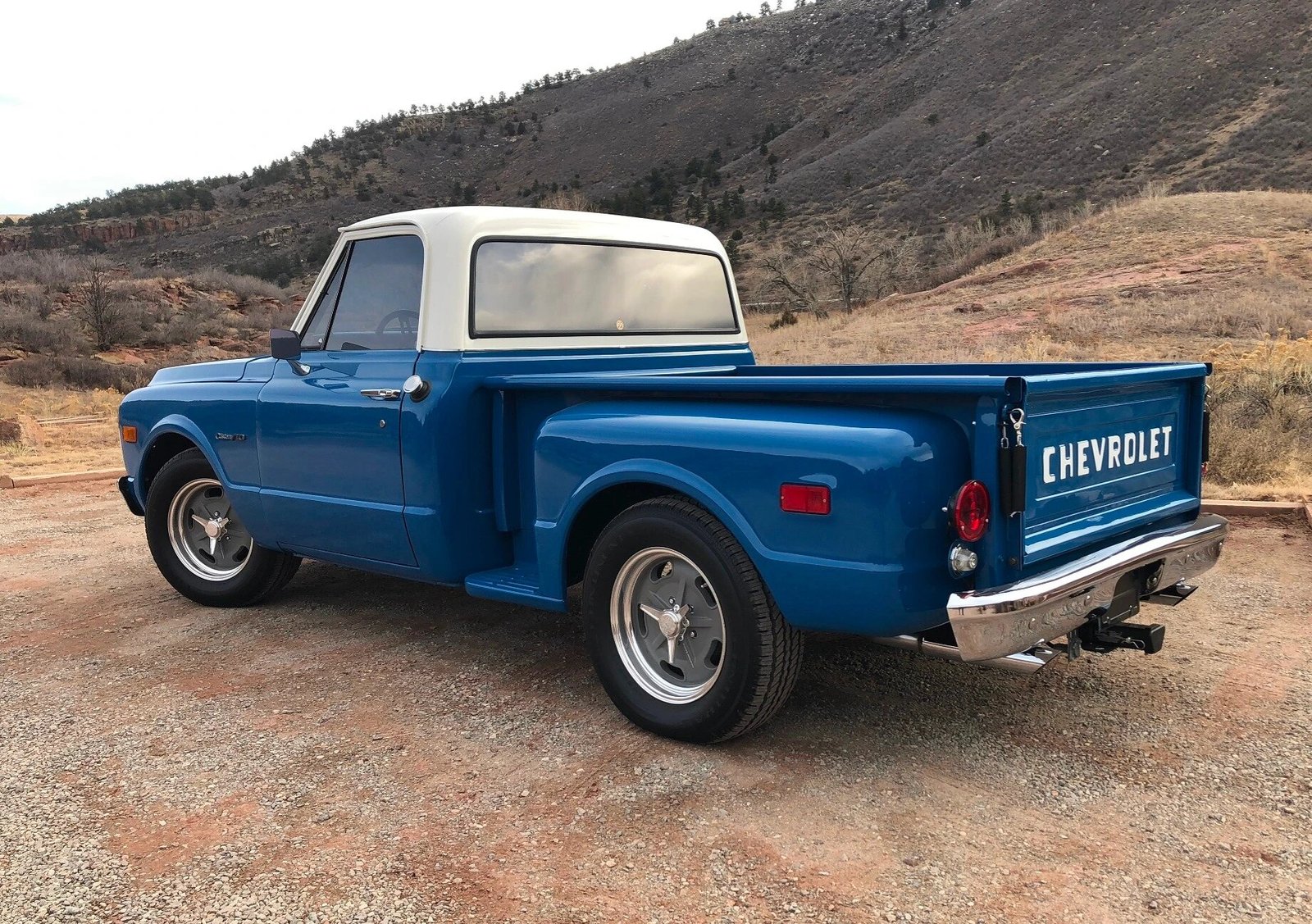 The Stepside body was stripped to bare metal before being repainted in its factory blue, and features a white cab with tinted windows.