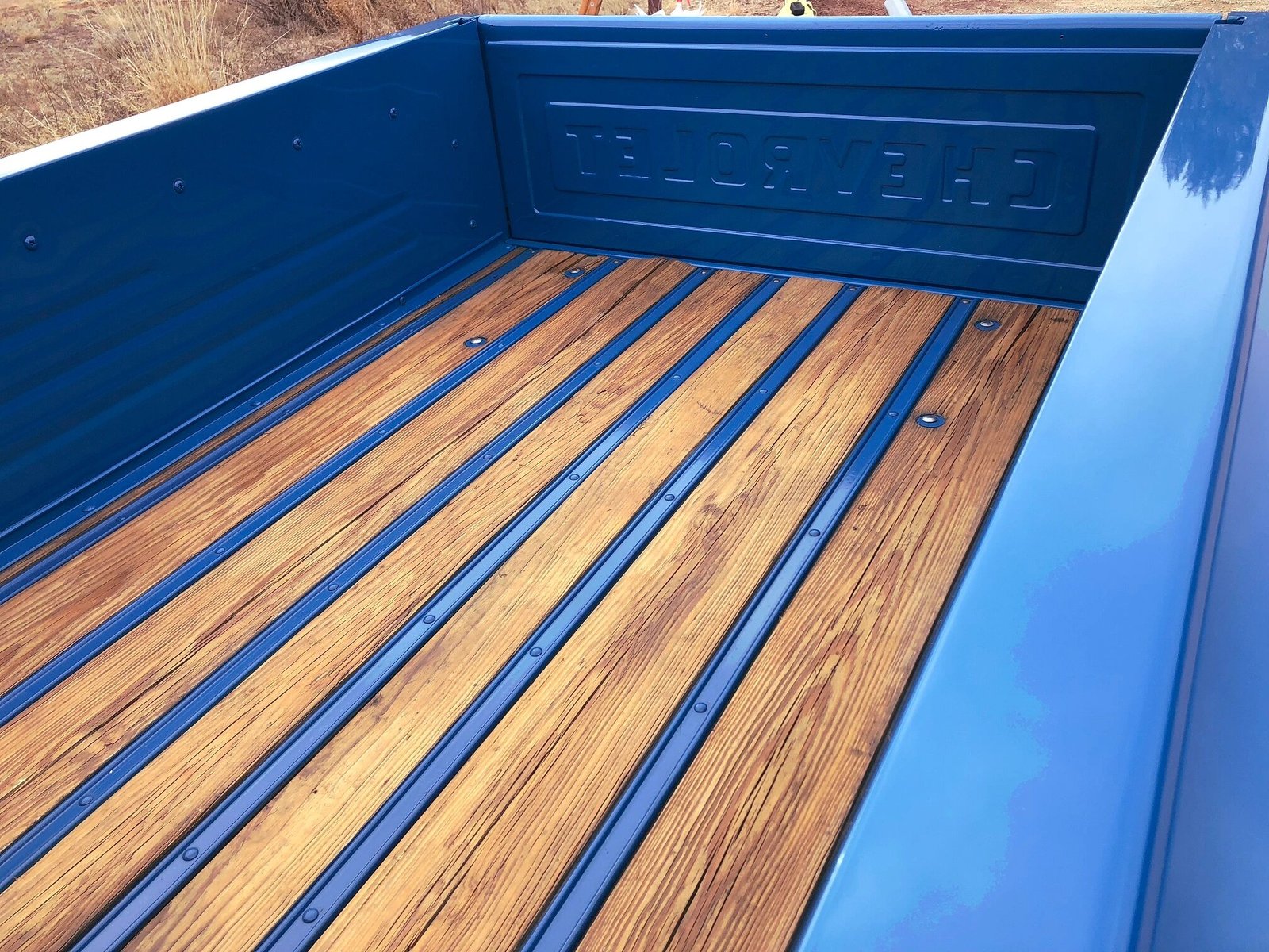 The truck is equipped with chrome front and rear bumpers, a receiver hitch, and wood planks with body-colored runners lining the bed floor.