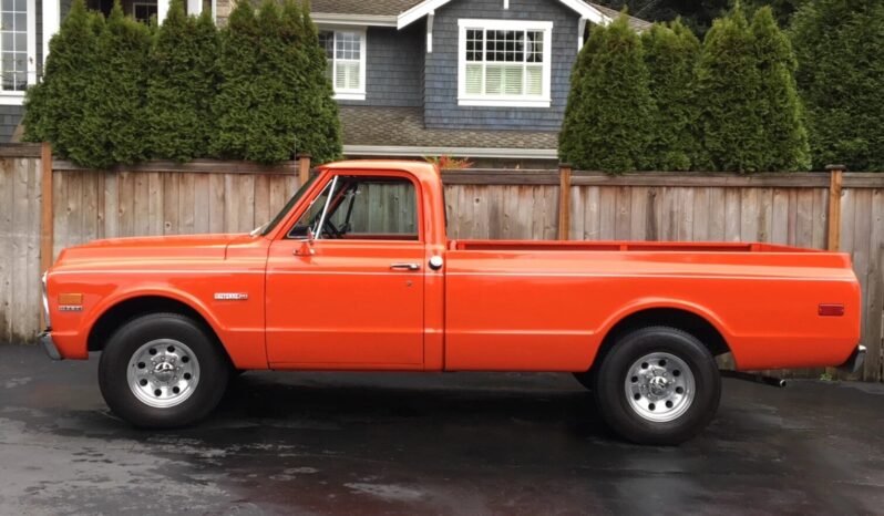 This 1971 Chevrolet C20 pickup is powered by a 350ci V8 paired with an automatic transmission and is finished in Omaha Orange over black.