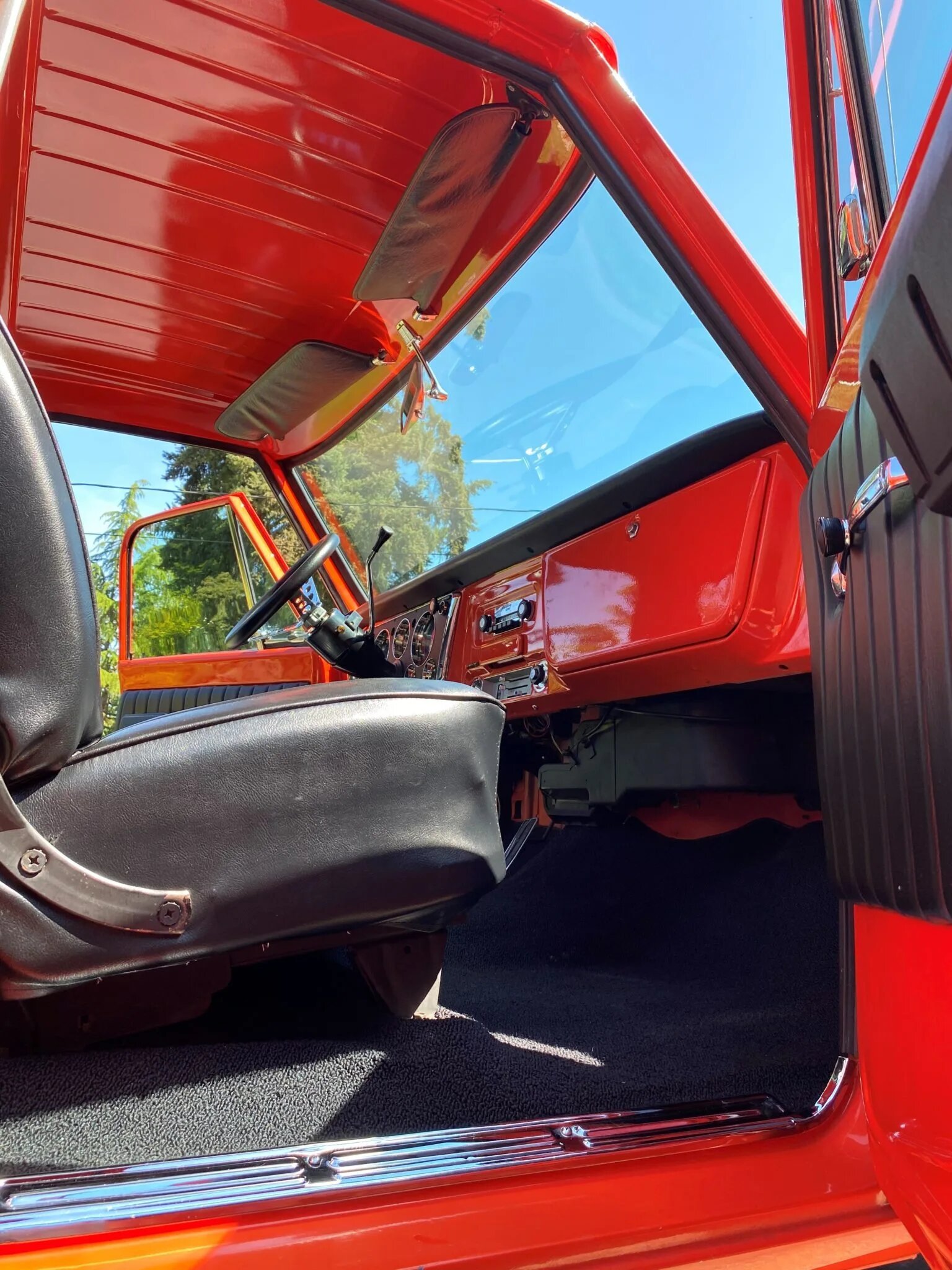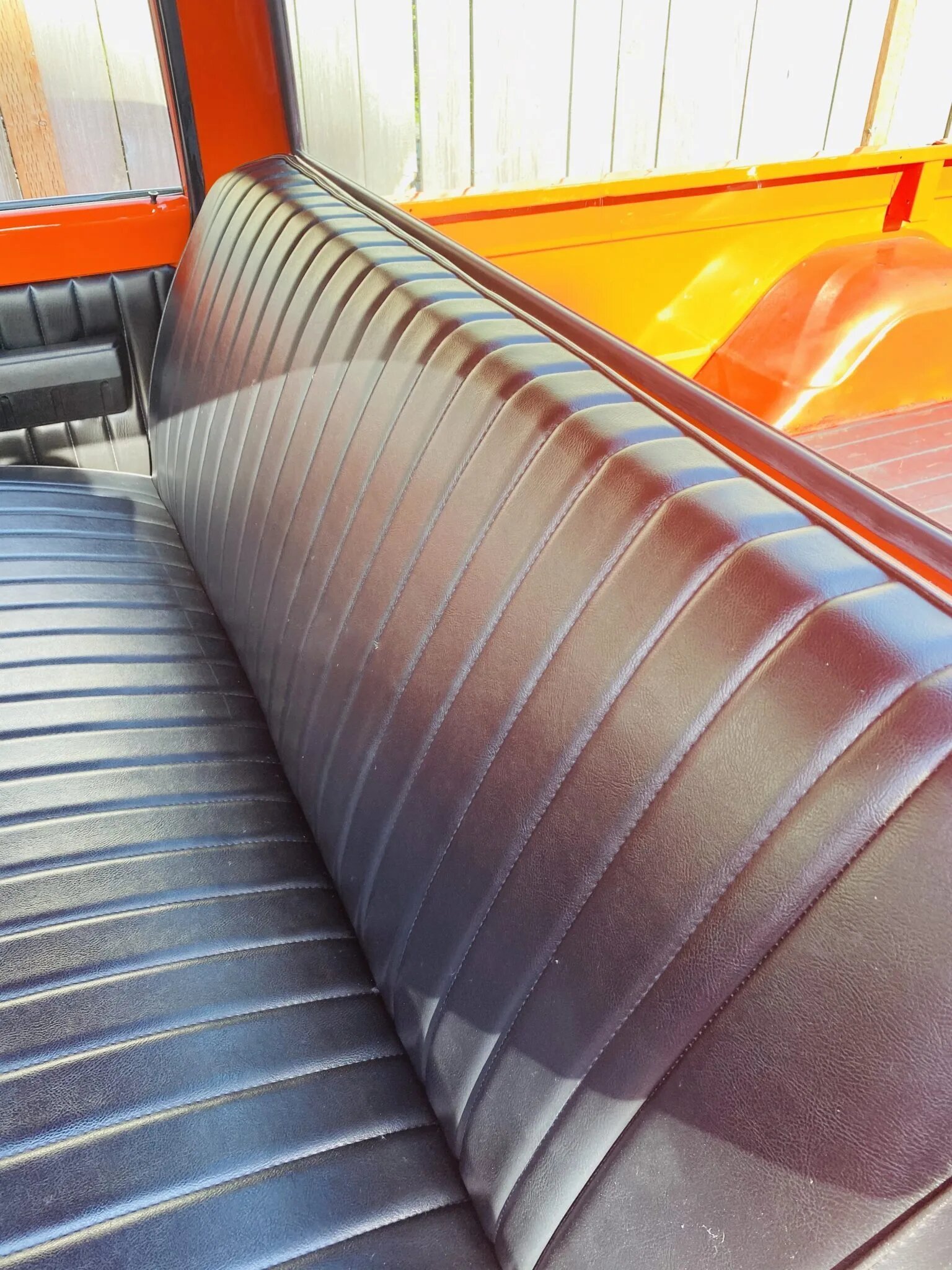 The cabin features a bench seat finished in black and a matching dash topper and door panels.