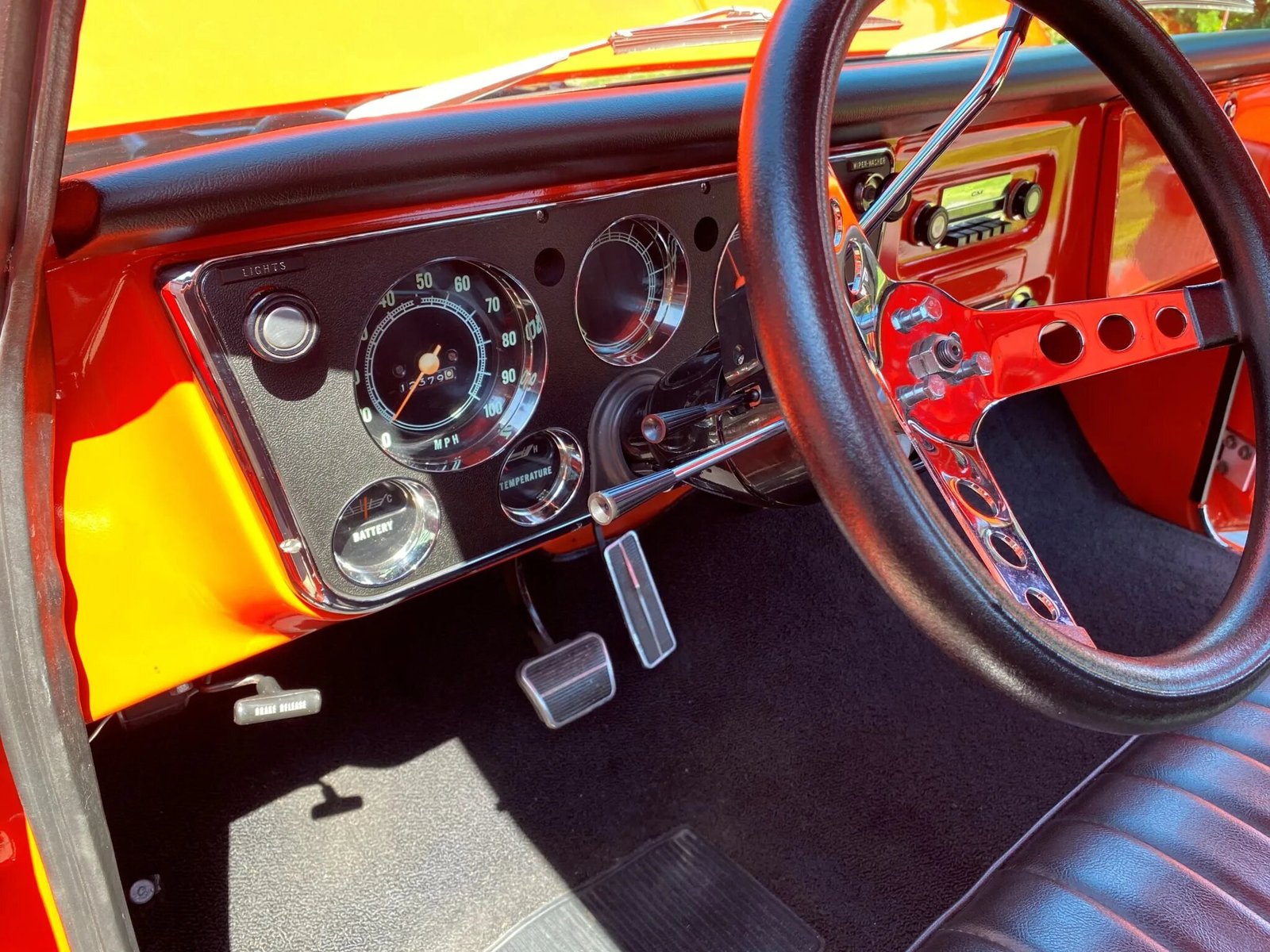 The three-spoke steering wheel fronts a 100-mph speedometer and gauges for temperature, oil pressure, fuel level, and battery.