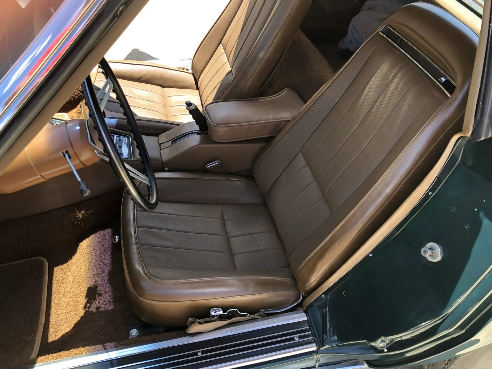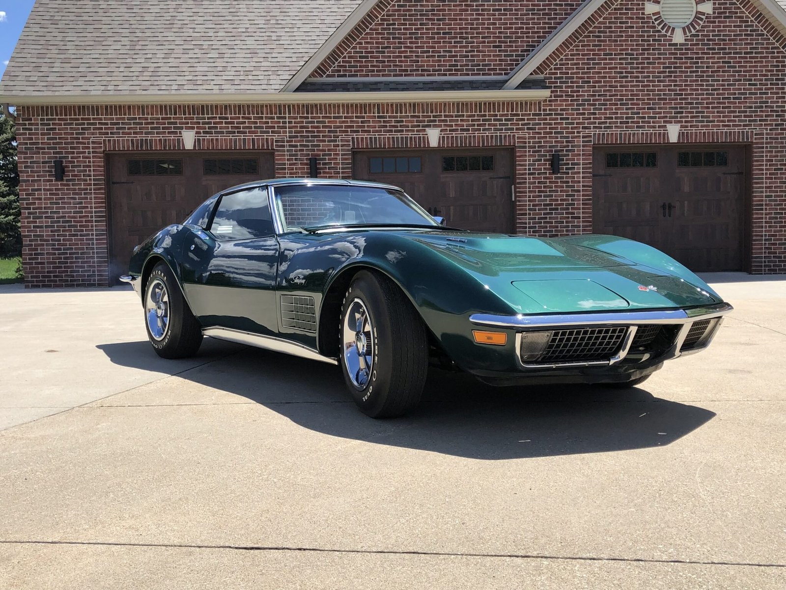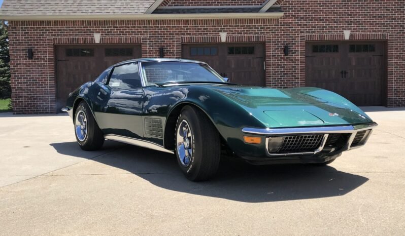 This 1971 Corvette is finished in green over tan vinyl and powered by a 454ci LS5 V8 paired with a four-speed manual transmission. Equipment includes 15″ Rally wheels, power brakes, power steering, a cowl hood, air conditioning, a pushbutton AM/FM radio, and removable body-color roof panels.