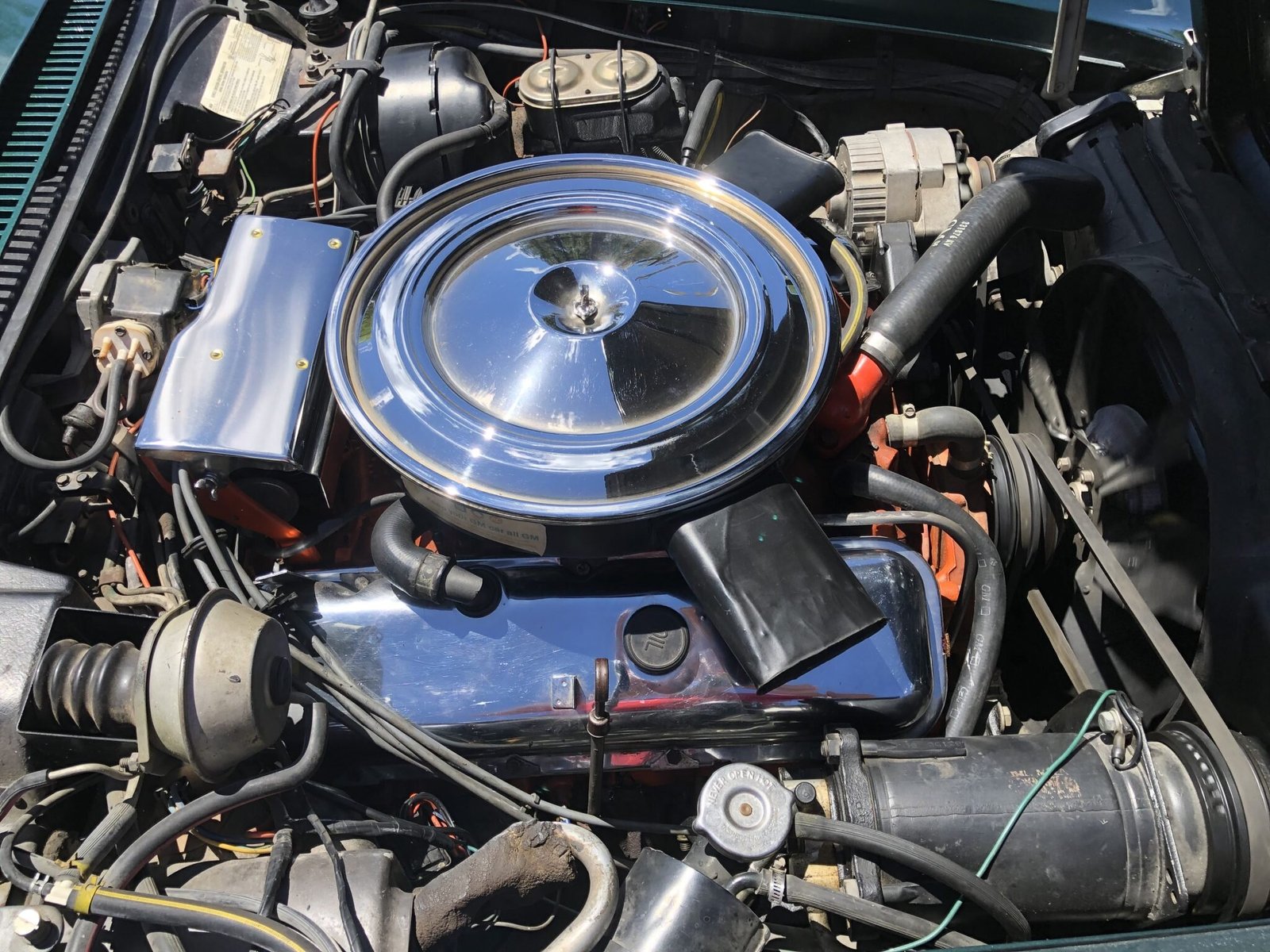 The car left the factory in Brands Hatch Green (983) and features removable body-color roof panels, chrome bumpers, pop-up headlamps, a cowl hood, fender vents, polished rocker trim, and dual exhaust outlets.