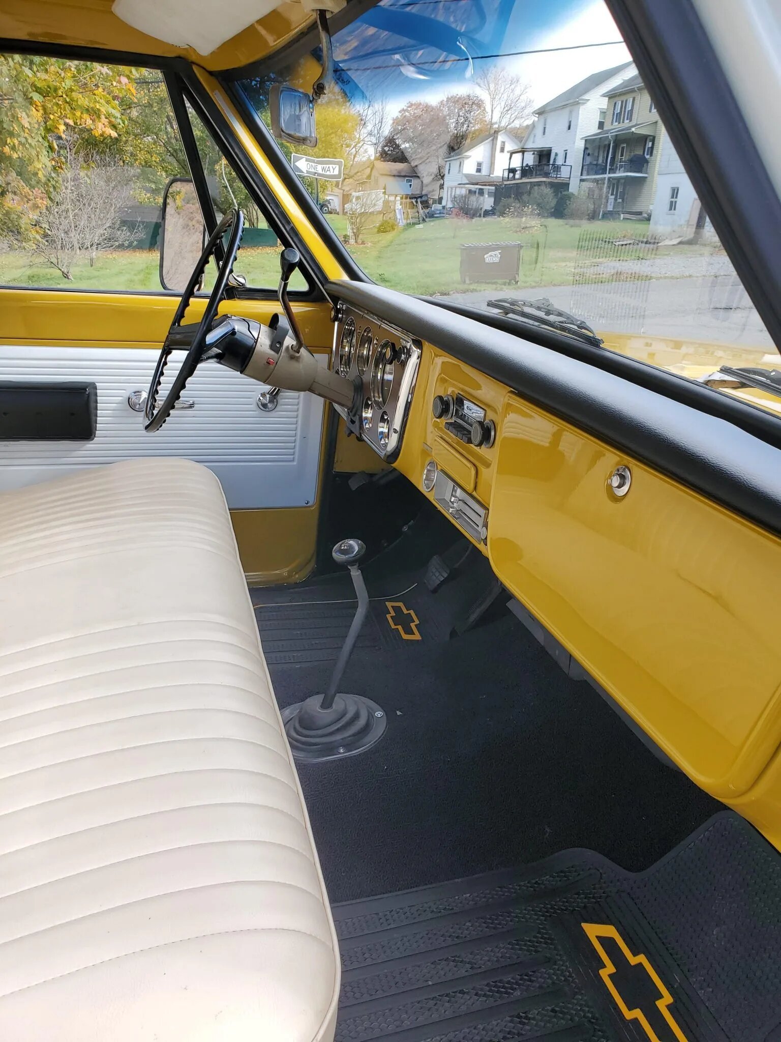 A factory push-button radio is fitted in the dash, and additional features include Chevrolet-logo floor mats, lap belts, and a glove box.