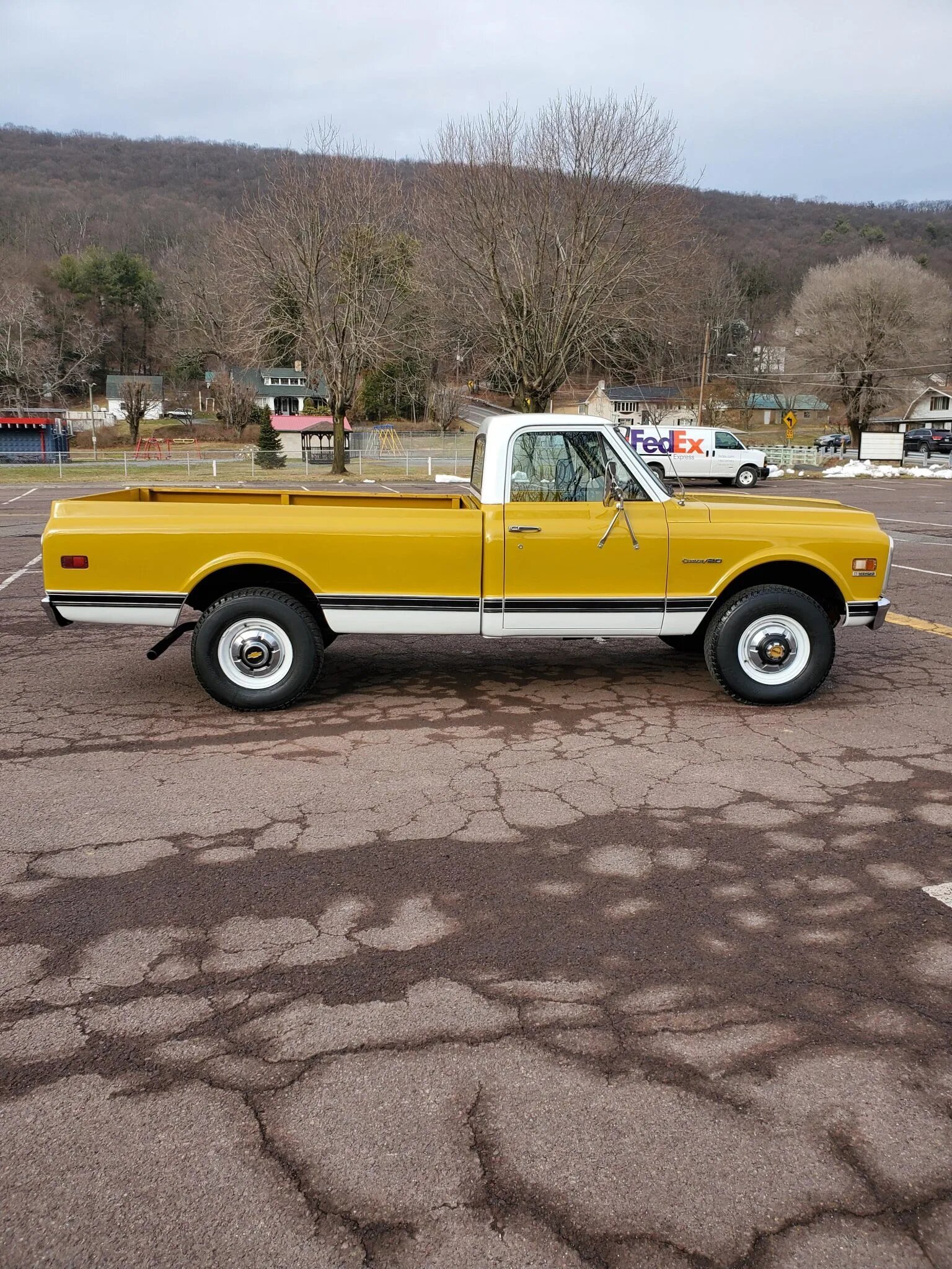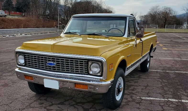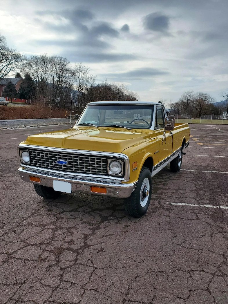 This 1971 Chevrolet K20 Custom is a four-wheel-drive pickup that is finished in yellow and white over a cream vinyl bench seat and is powered by a 350ci V8 paired with a three-speed automatic transmission and a dual-range transfer case.