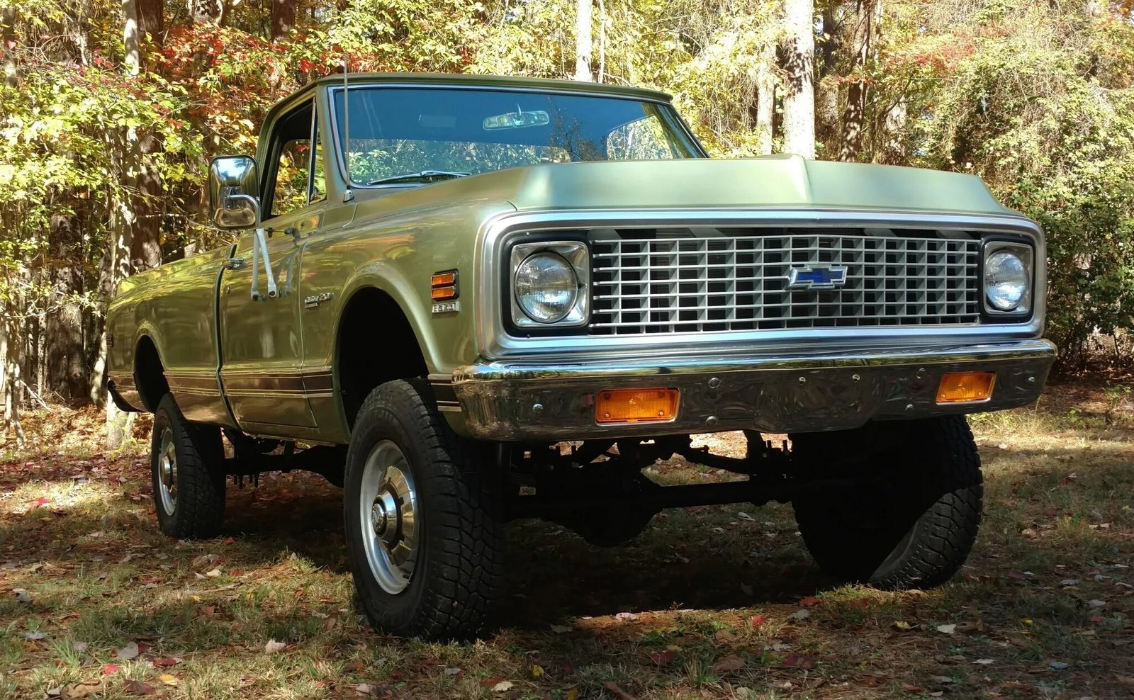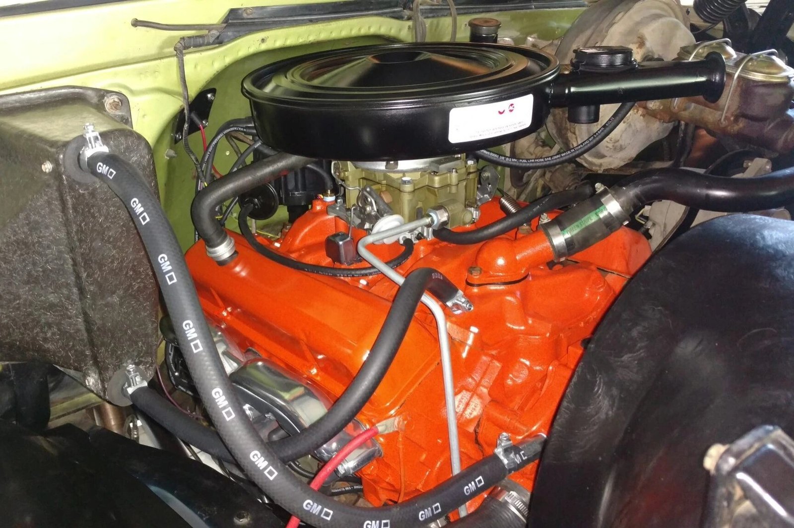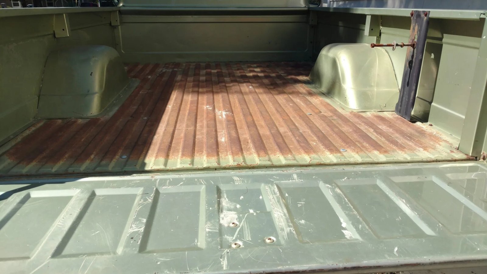 The truck is finished in Medium Olive over green vinyl upholstery and is powered by a 400ci V8 paired with a three-speed automatic transmission and a dual-range transfer case.