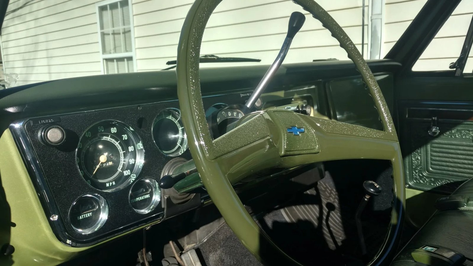 The cabin features a bench seat upholstered in green vinyl joined by matching embossed door panels with woodgrain accents.