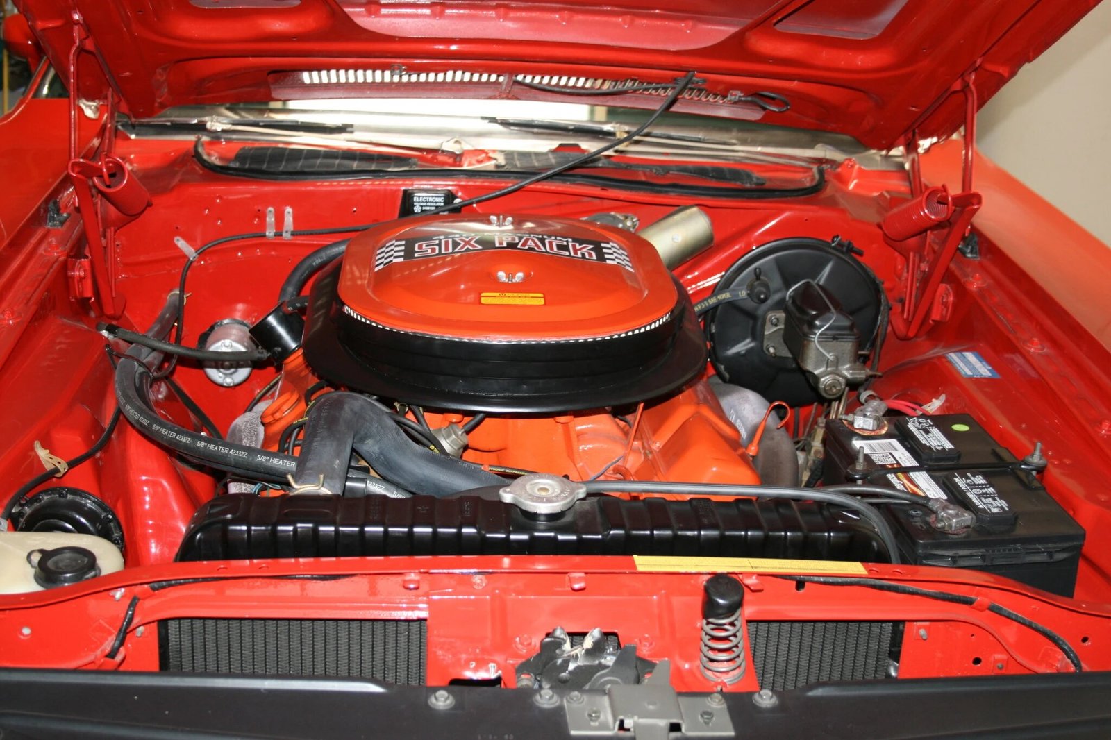 The 440ci E87 V8 was rated at 385 horsepower when new and is capped by an oblong air cleaner covering three two-barrel downdraft carburetors.