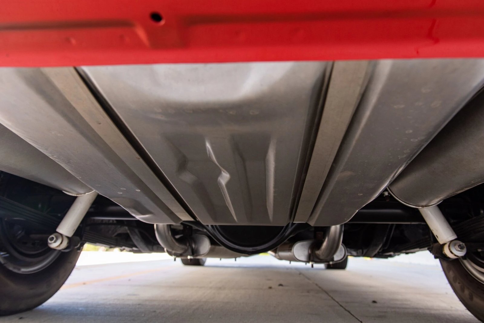 Painted 15″ Rallye wheels wear chrome beauty rings and are mounted with Goodyear Polyglas GT tires.
