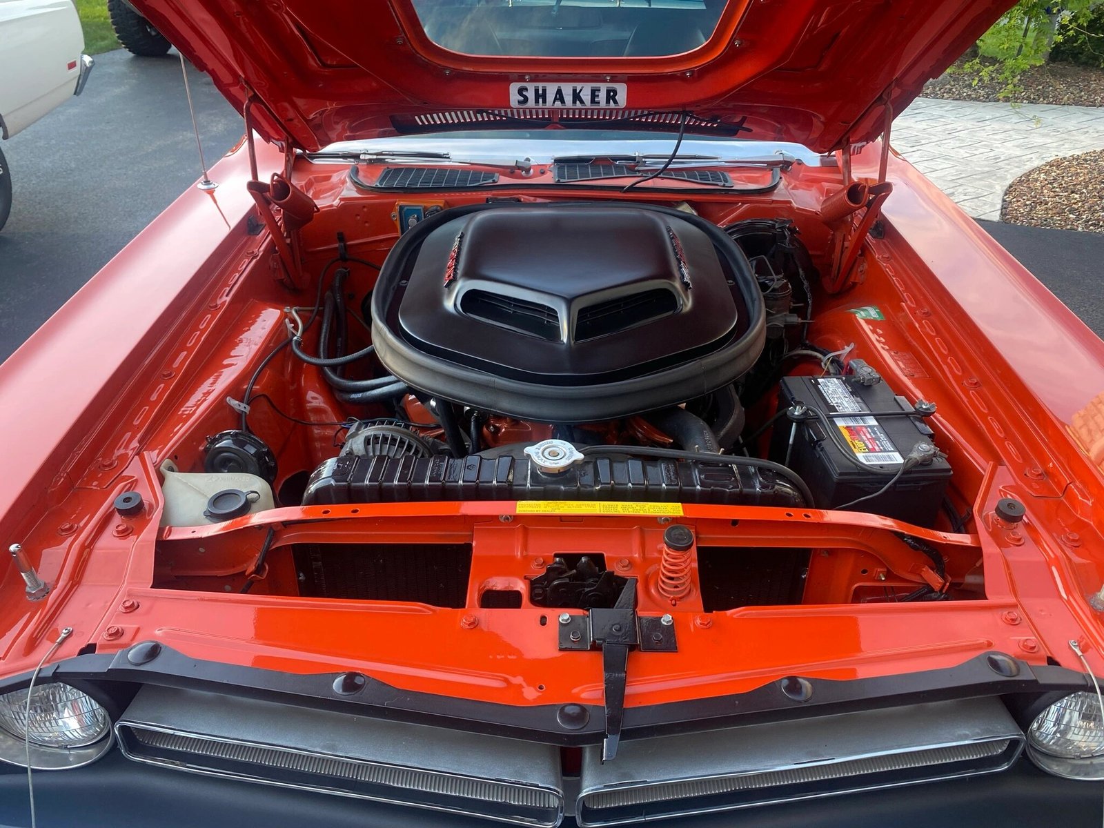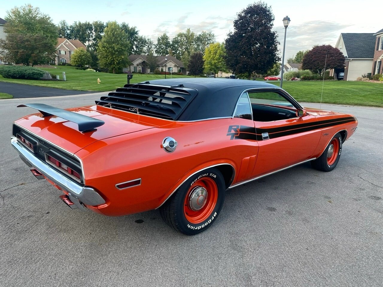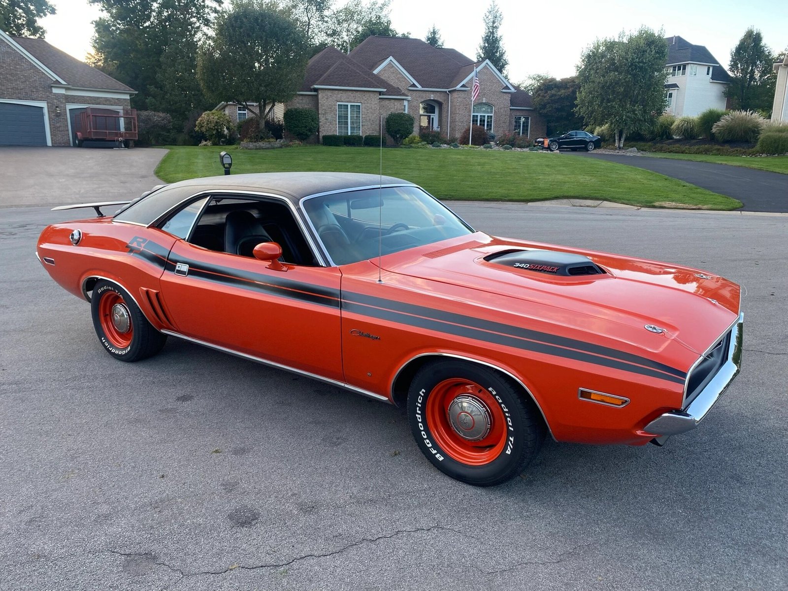 The Shaker hood features a scoop with air intakes bearing “340 SIXPACK” badging, while other exterior touches include a bright-finished fuel-filler flap and dual color-keyed side mirrors along with a black vinyl roof, rear spoiler, window louvers, side-stripes, and R/T graphics.