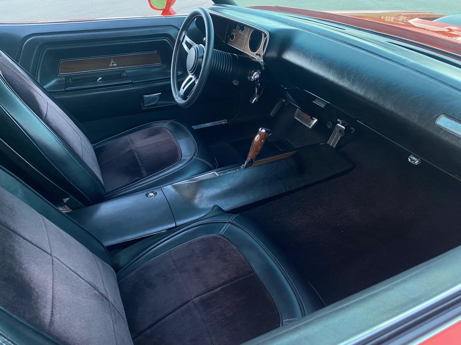 A black dashboard accompanies matching carpets and Challenger R/T-branded floor mats, while modifications included a pistol-grip shifter and an aftermarket head unit with USB/AUX inputs and Bluetooth connectivity.