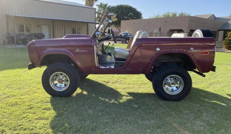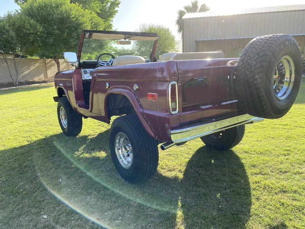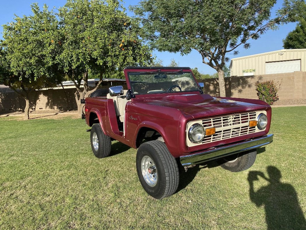 The truck is finished in burgundy over Parchment upholstery and is powered by a replacement 351ci V8 paired with a three-speed manual transmission and a dual-range transfer case.