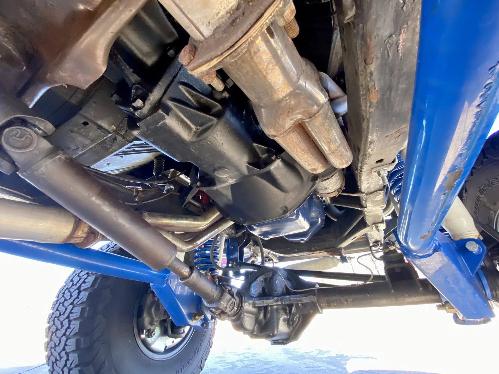 The truck is equipped with power steering, Warn locking front hubs, and a James Duff suspension which includes progressive rate coil springs, shock hoops, shock absorbers, polyurethane bushings, and long-travel radius arms.