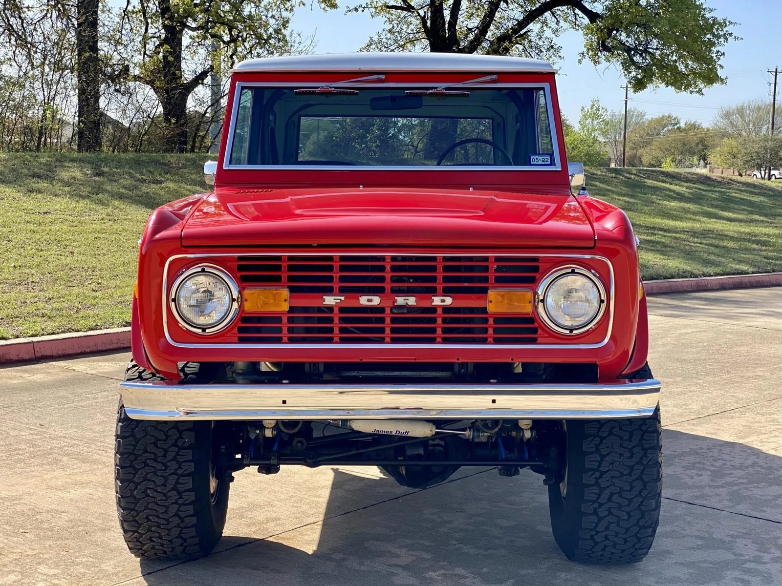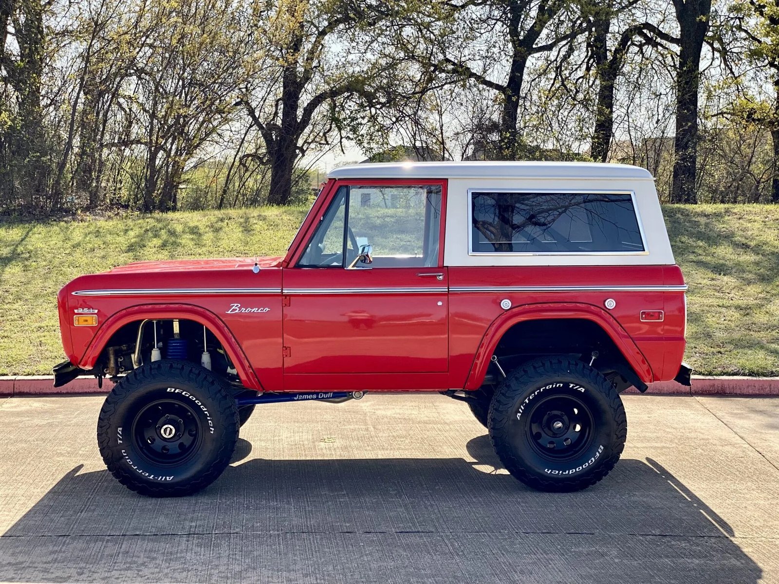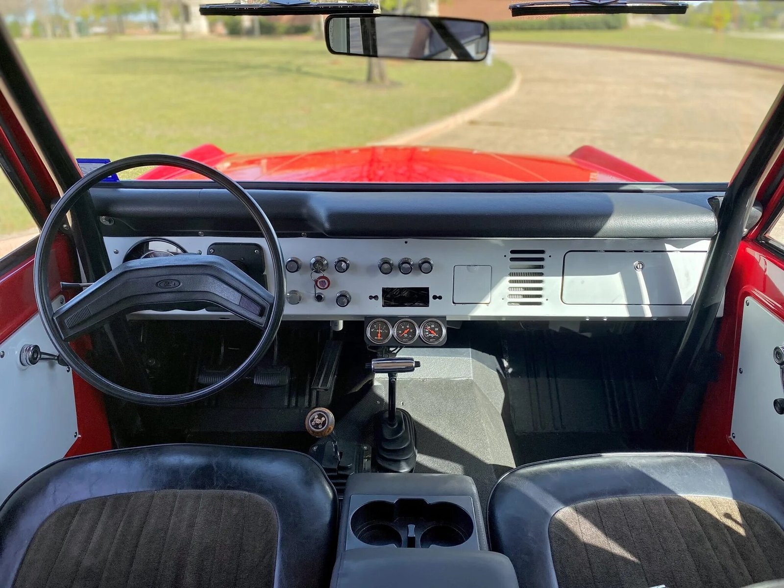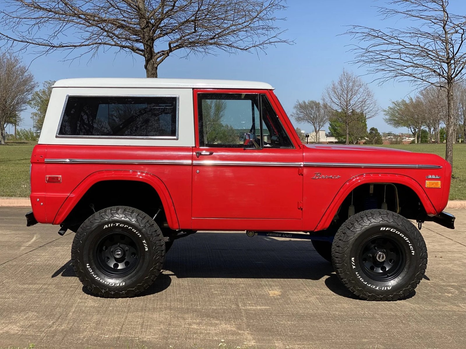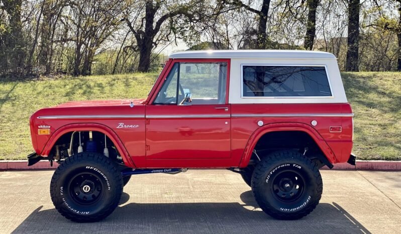 This 1971 Ford Bronco is finished in red over black and powered by a replacement 351ci V8 paired with a three-speed manual transmission and a dual-range transfer case.