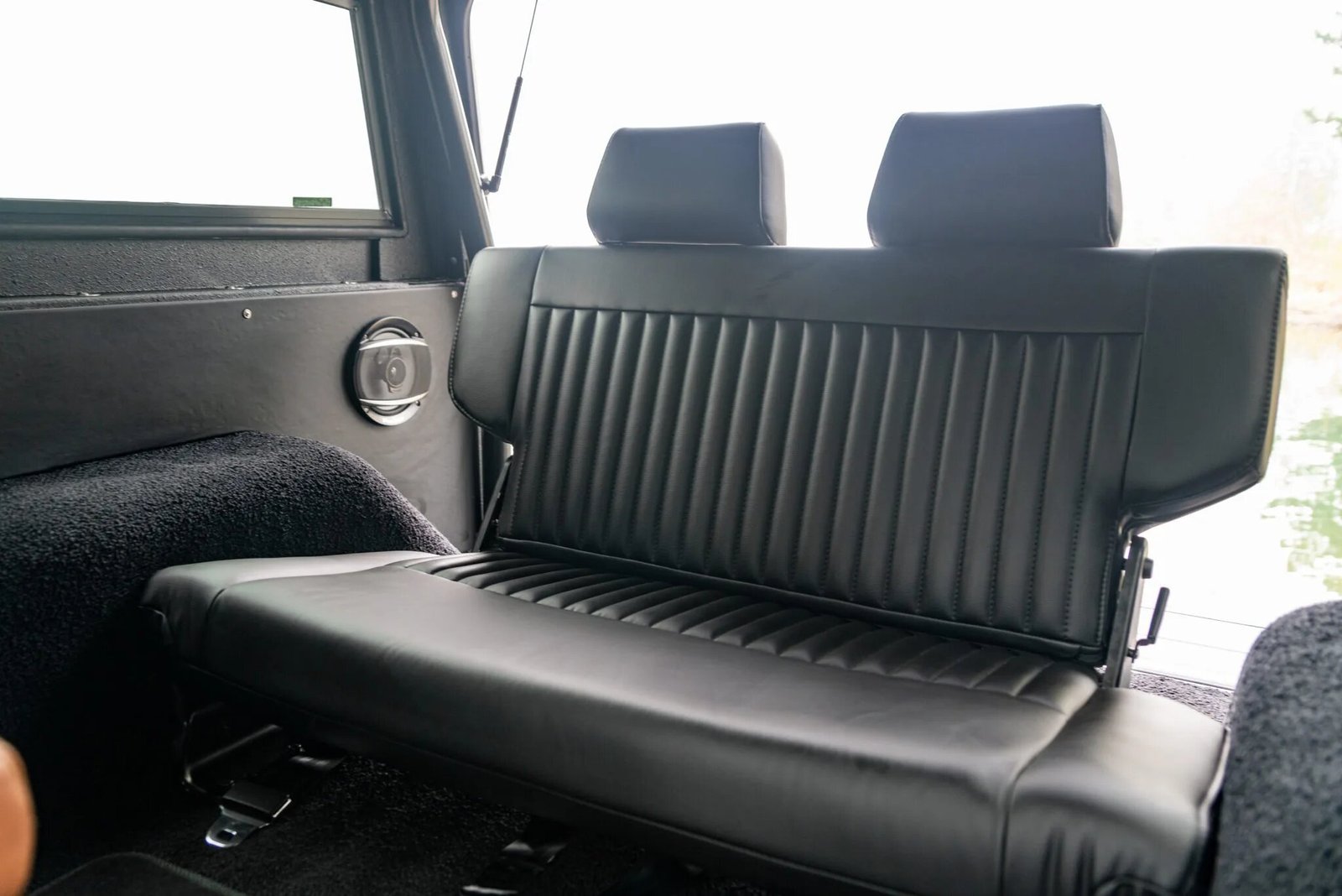 The cabin features high-back bolstered black leather front seats with three-point seat belts, a matching rear bench, black carpets, and a powder coated dash and door panels.