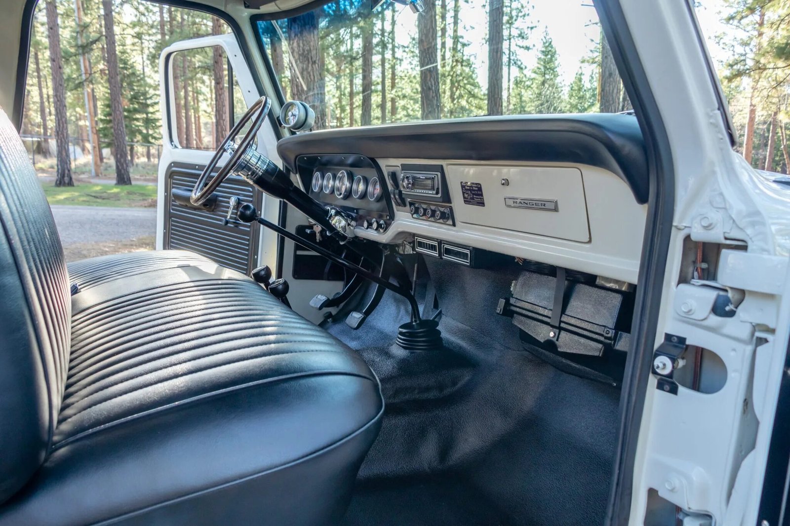 The cabin features a bench seat upholstered in black vinyl as well as matching door panels, rubberized floor coverings, and a replacement vinyl dashboard pad.