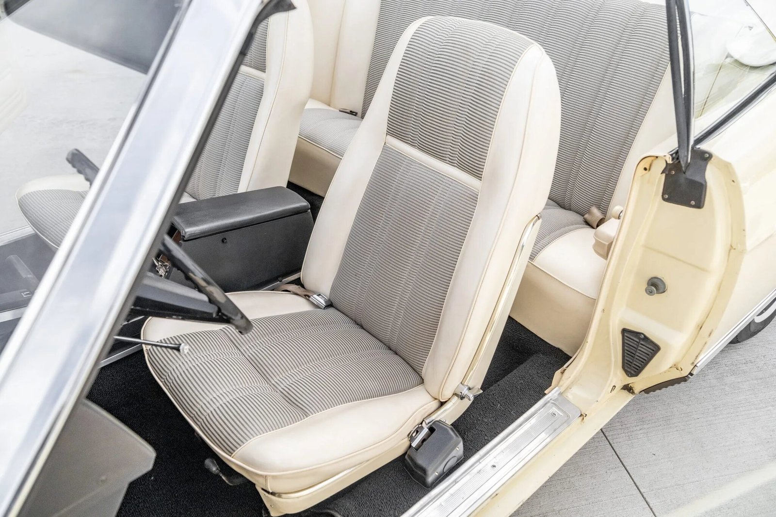 The seats are trimmed in white vinyl with patterned black inserts, while the black dashboard is accented by faux woodgrain trim.