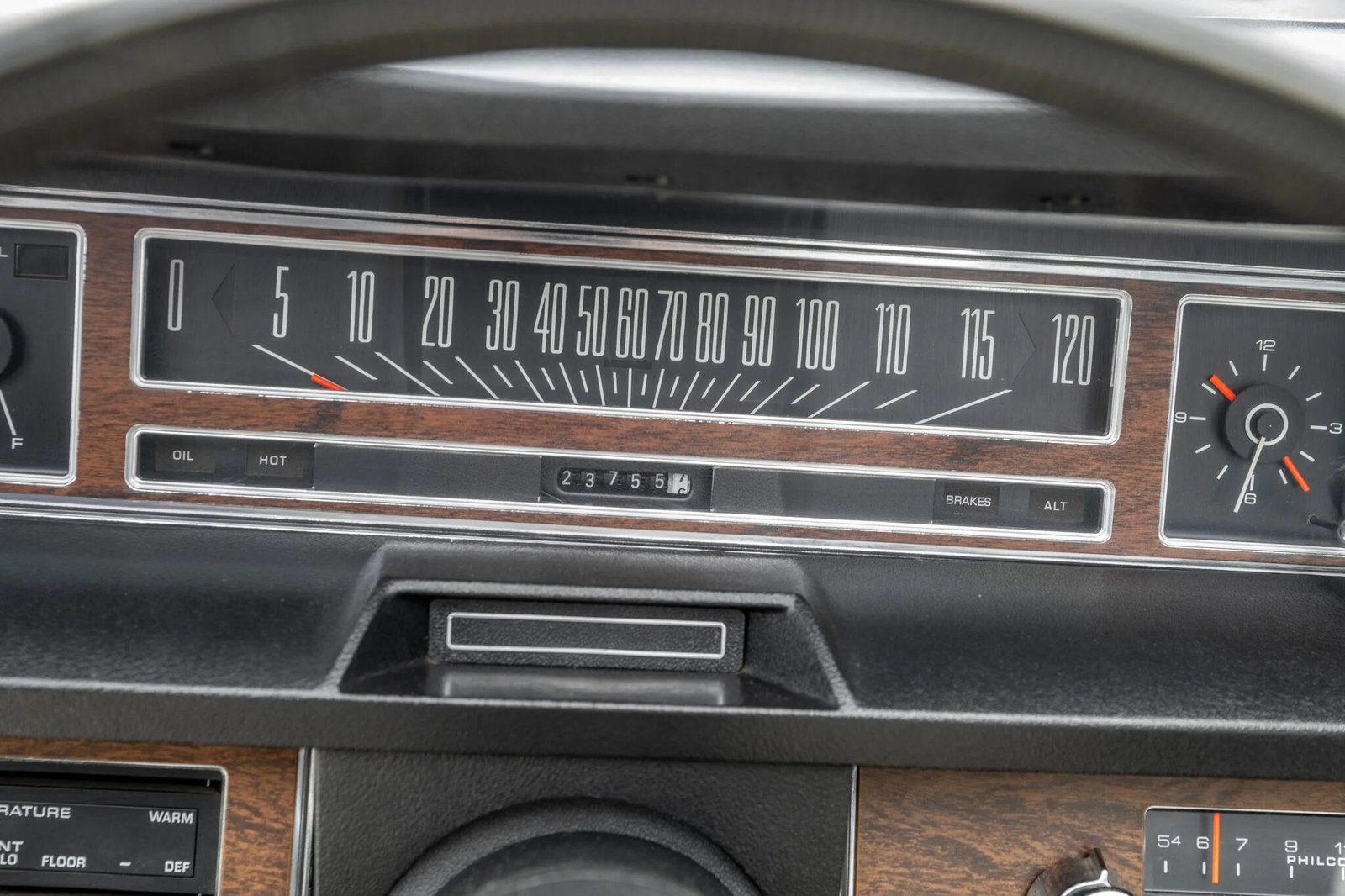 The two-spoke steering wheel frames factory instrumentation including a 120-mph speedometer, a clock, and a fuel gauge.