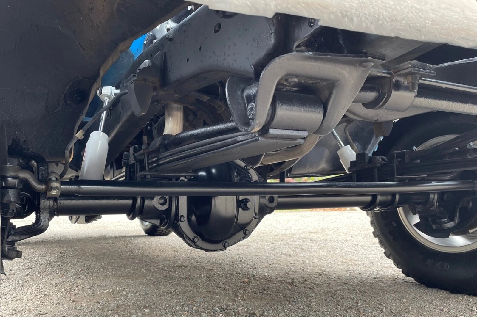Polished 16″ American Racing aluminum wheels are mounted with 265/75 Hankook Dynamic MT tires. Superwinch locking hubs are equipped up front, and the truck also features Tuff Country shock absorbers.