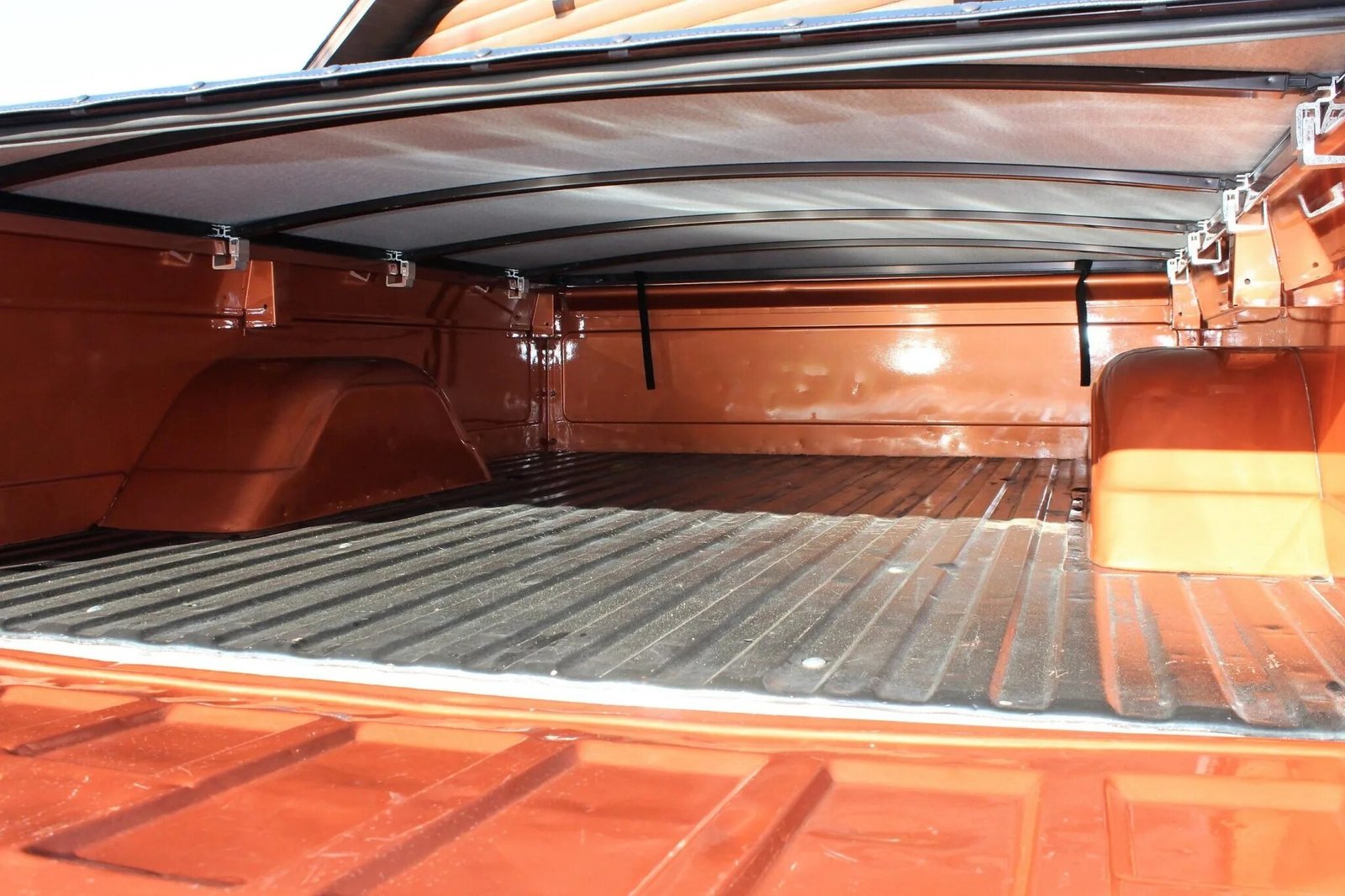 A roll-up bed cover has been fitted. Silver-painted 15″ steel wheels with chrome trim rings wear 235/75 Firestone FT70c whitewall tires.