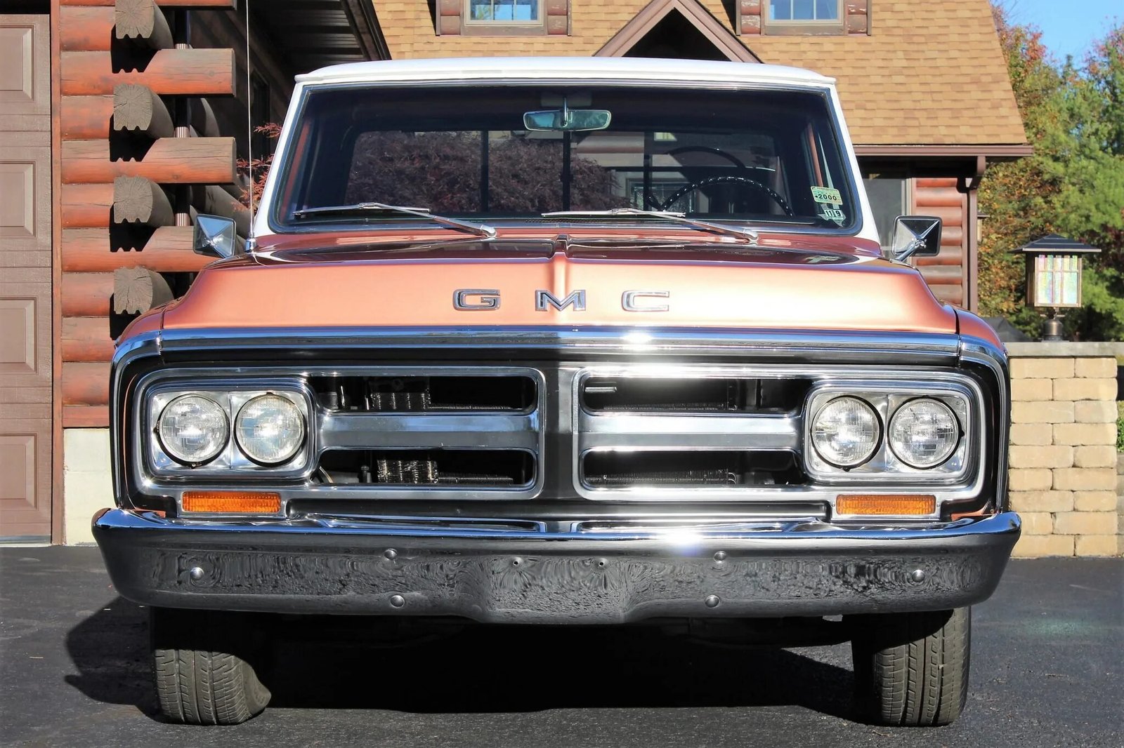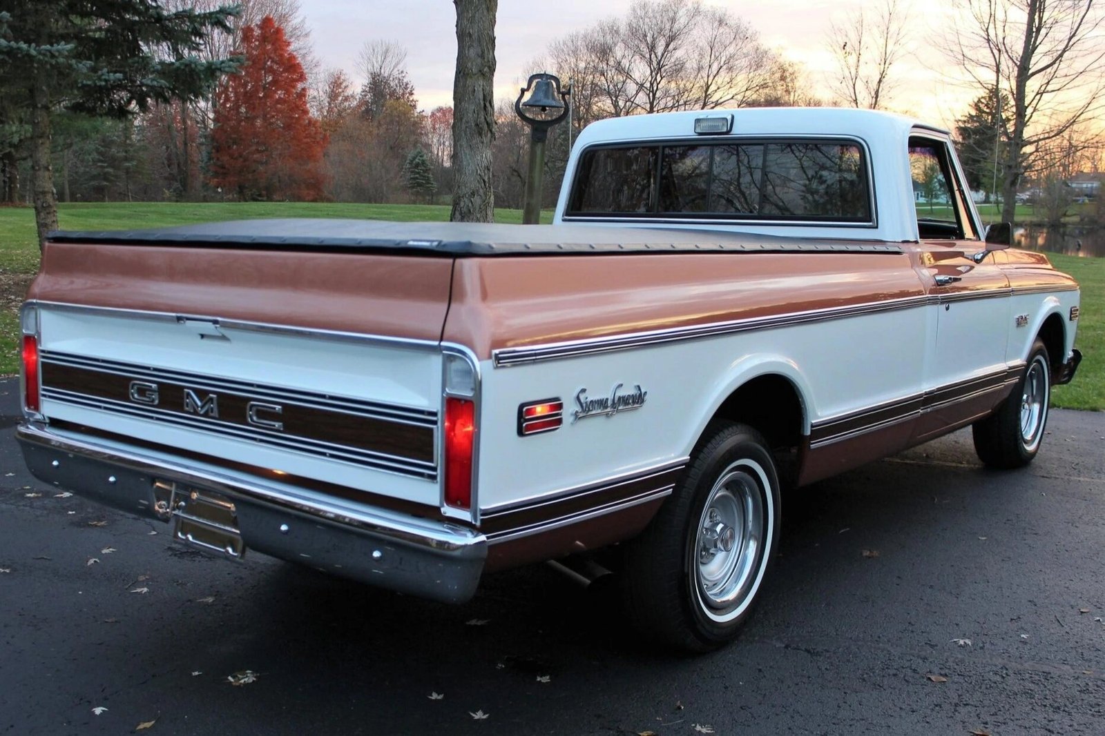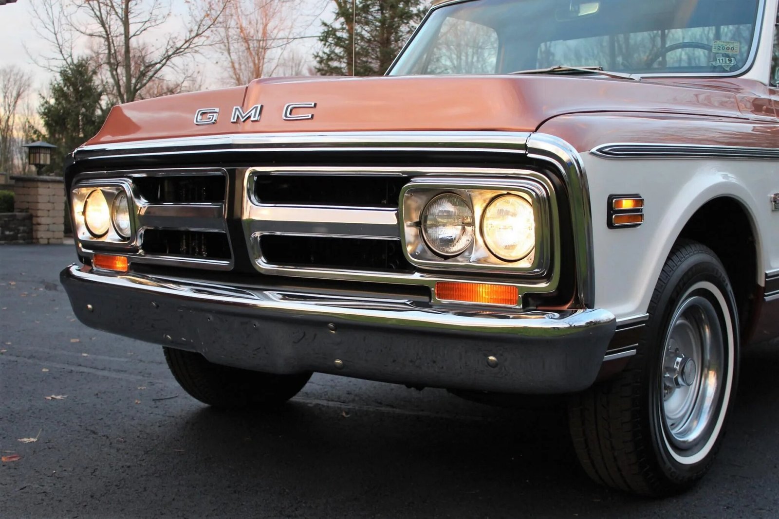 This 1971 GMC Sierra Grande 1500 pickup is powered by a 396ci V8 mated to a three-speed Turbo Hydra-Matic automatic transmission and finished in bronze and white over a black interior.
