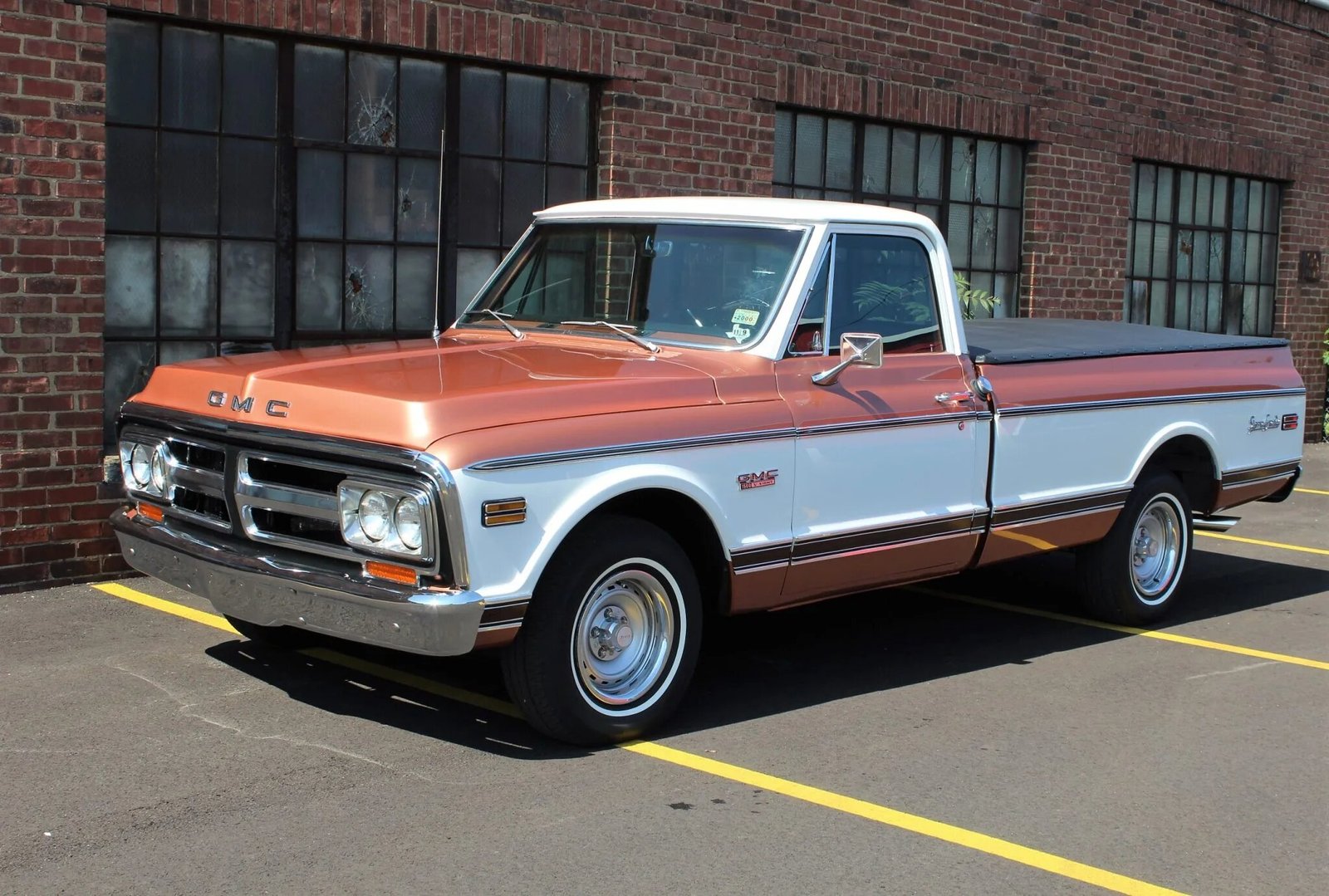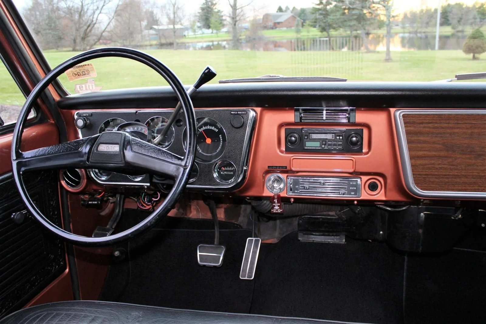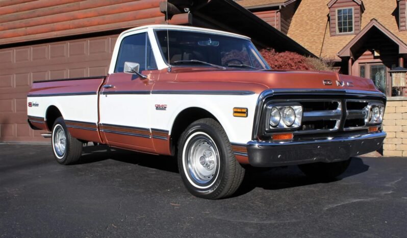 This 1971 GMC Sierra Grande 1500 pickup is powered by a 396ci V8 mated to a three-speed Turbo Hydra-Matic automatic transmission and finished in bronze and white over a black interior.