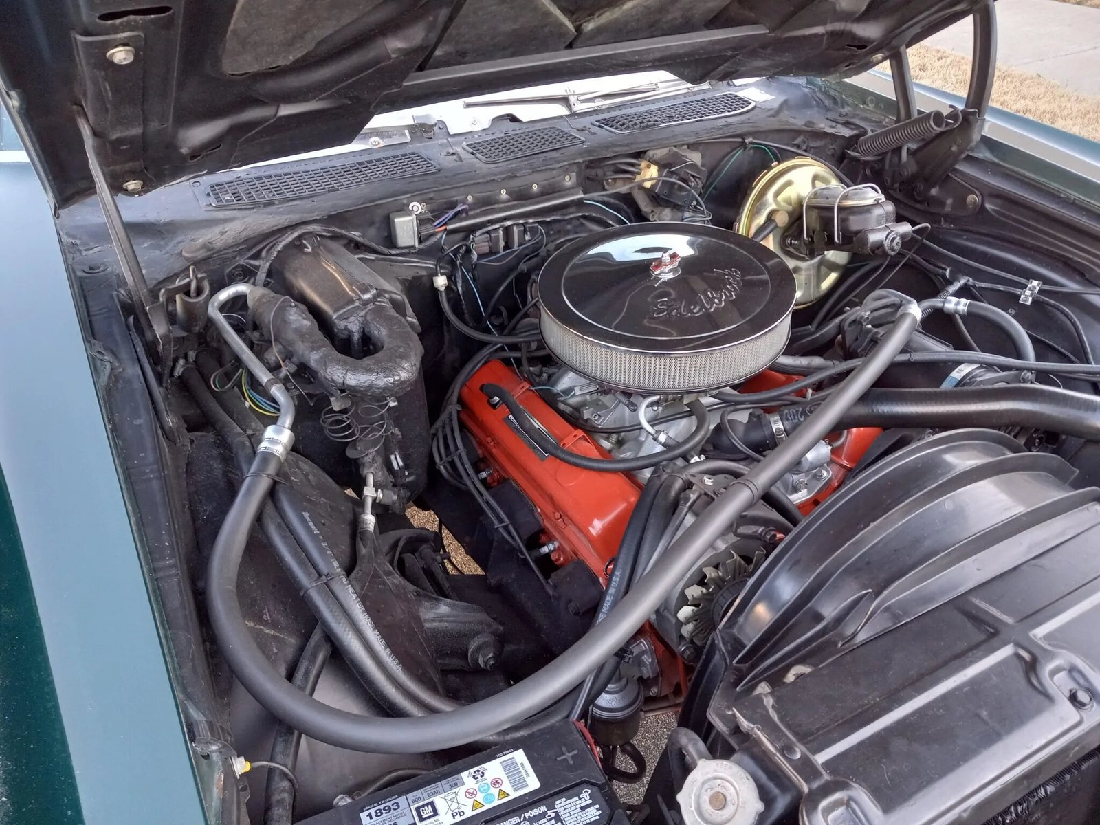 The replacement 350ci V8 crate engine is equipped with an Edelbrock air cleaner and a four-barrel carburetor.