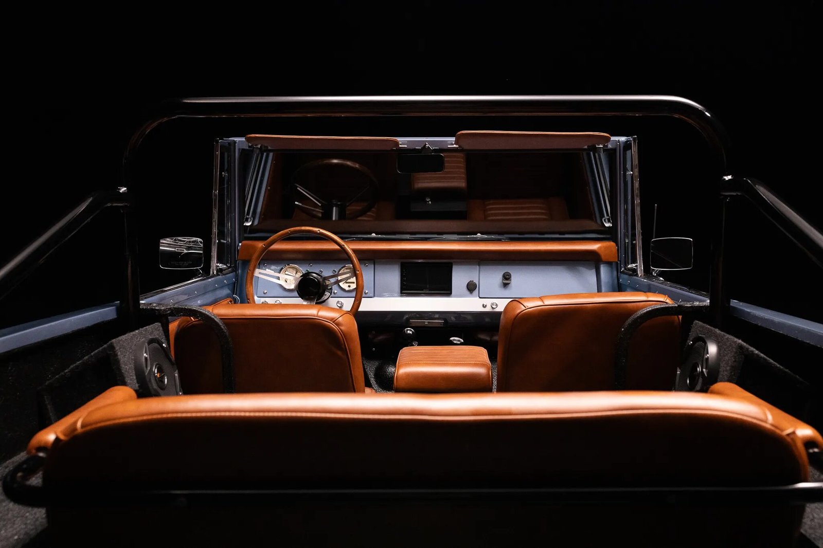 The body was removed from the frame, media-blasted, and affixed to a rotisserie before being fitted with replacement sheetmetal from IH Parts America. It was subsequently repainted in Ford Brittany Blue. The front grille, headlight rings, and window frames have been chrome-plated, and exterior hardware and weatherstripping replaced at the time of the paintwork. Further details include custom black-finished bumpers and black tailgate lettering as well as LED headlights, an electric windshield wiper mechanism, vent windows, and chrome dual exhaust outlets. A black Softopper removable soft top will accompany the truck.
