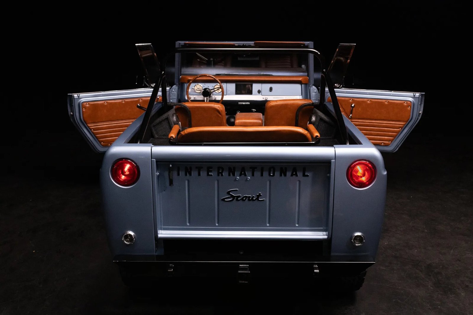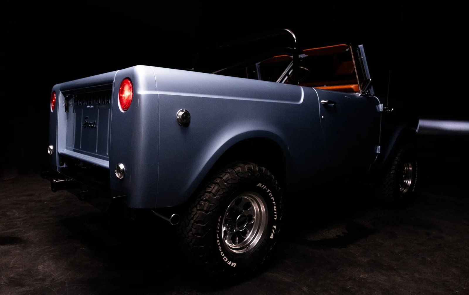 This 1971 International Harvester Scout 800B was subsequently refurbished and modified. Work have involved removing the body from the frame, carrying out metal repairs, repainting the truck in metallic blue, and re-trimming the interior in brown marine-grade upholstery as well as rebuilding the replacement 345ci V8, 727 three-speed automatic transmission, and Dana 20 dual-range transfer case. A Rough Country 2.5″ lift kit with Bilstein shocks was also added along with Mickey Thompson 15″ alloy wheels, four-wheel disc brakes, a Scout II-sourced steering box, Holley Sniper electronic fuel injection, and a dual exhaust system with Flowmaster mufflers. Further equipment includes a four-point roll bar, heated front bucket seats, an Ididit tilt steering column, Omega Kustom Instrument Company instrumentation, and a Kenwood touchscreen head unit connected to JBL speakers.