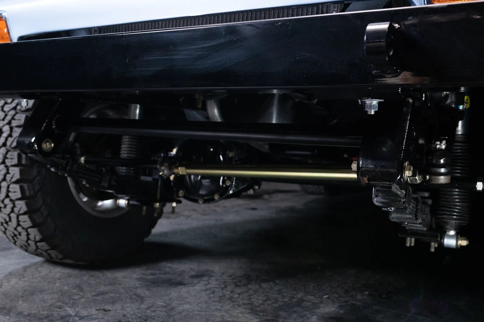 Power is sent to the rear or all four wheels through a 727 three-speed automatic transmission and a Dana 20 dual-range transfer case, both of which are said to have been overhauled as a part of the refurbishment. A heavy-duty clutch assembly and resized driveshafts have also been added. The frame was powder coated in a gloss black finish, and the underside refinished using a gloss black Raptor textured coating. The dual exhaust system features a crossover pipe as well as Flowmaster mufflers.