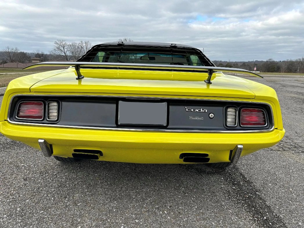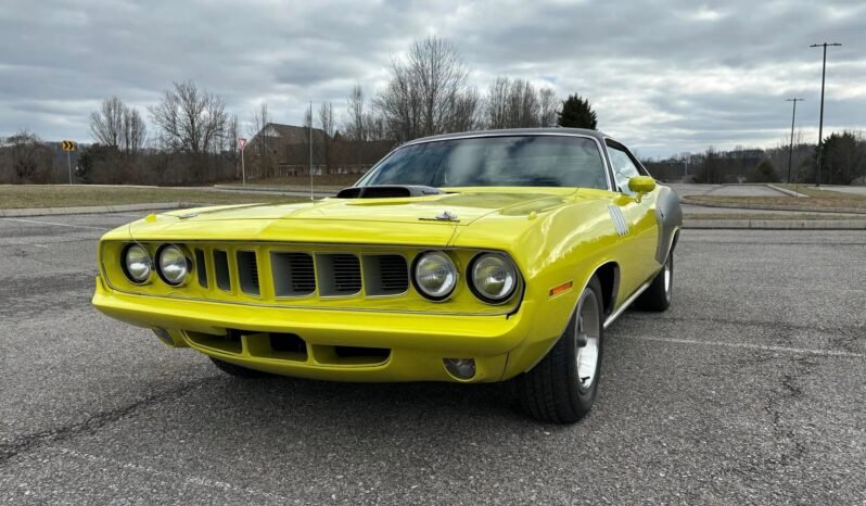 This 1971 Plymouth ’Cuda coupe was refurbished and is powered by a rebuilt, overbored V-code 440ci V8 with triple two-barrel carburetors. Finished in Curious Yellow with a black roof and billboard stripes, the car is also equipped with a three-speed automatic transmission, 15″ Rallye wheels, a Custom Autosound stereo, a TTi dual exhaust system, rear window louvers, and dual fender tags, which note factory options including a rear wing, the Light Package, power-assisted front disc brakes, a Shaker hood secured by pins, dual side mirrors, front bucket seats upholstered in black, and Rallye instrumentation.