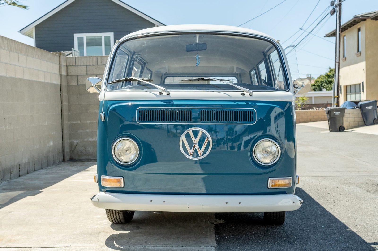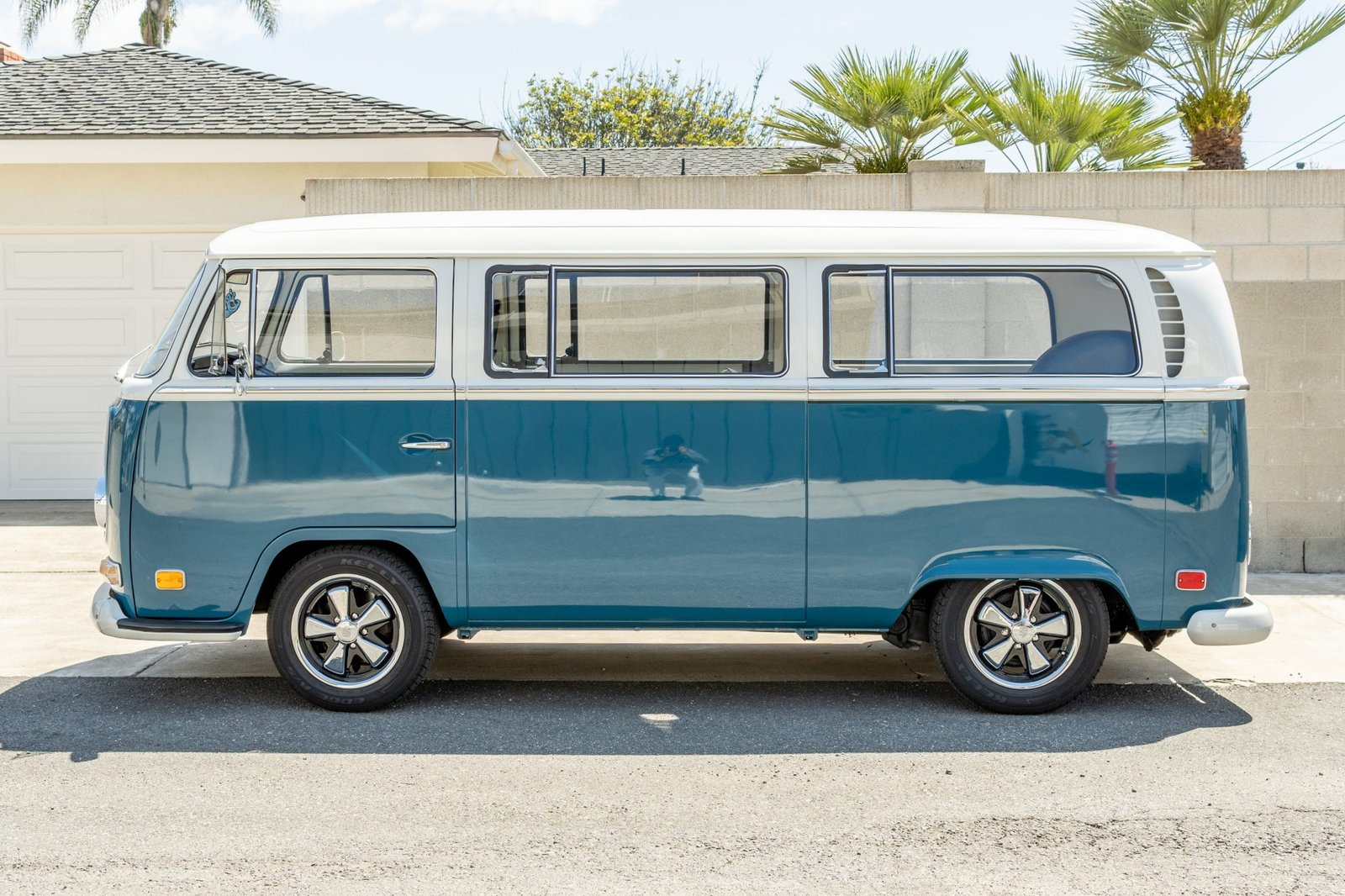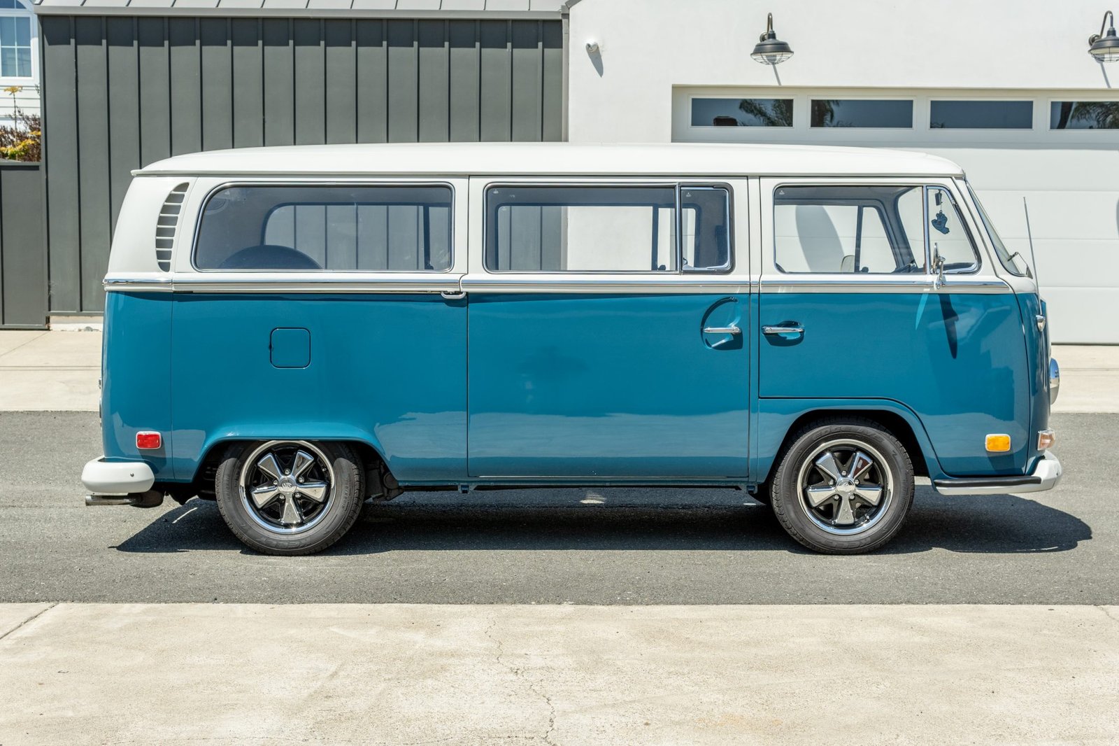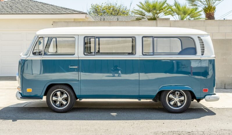 Power comes from a 1.6-liter flat-four paired with a four-speed manual transaxle, and additional equipment includes 15″ Fuchs-style wheels, front disc brakes, drop spindles, a single exhaust outlet, a sliding passenger-side rear door, vent windows, seating for seven, Dynamat sound deadening, a retro radio with Bluetooth integration, and Pioneer speakers.