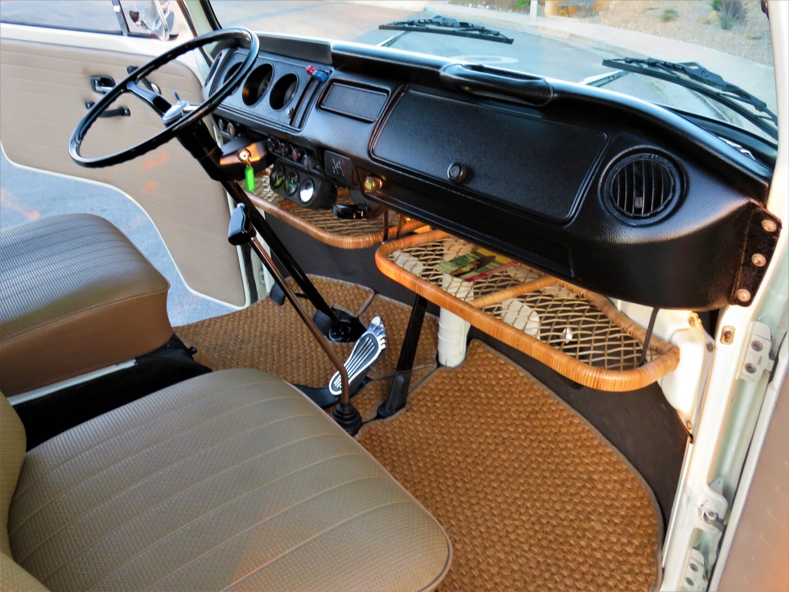 The forward cabin features bucket seats upholstered in tan vinyl, Coco Mats, and woven basket-style shelves below the black dashboard.