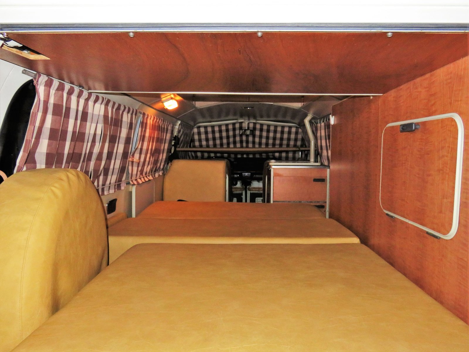 The rear cabin features woodgrain paneling, a fold-away table, golden yellow upholstery, a rear bench seat that folds flat, and patterned window curtains.