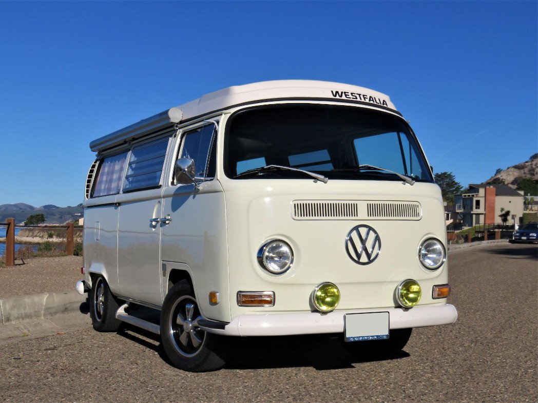 Equipment includes 15″ Fuchs wheels, drilled and ventilated front disc brakes, lowering spindles, dual Weber carburetors, yellow front driving lights, a Catalina awning, a fold-down rear bench seat, a refrigerator, a sink, and a rear mosquito net.