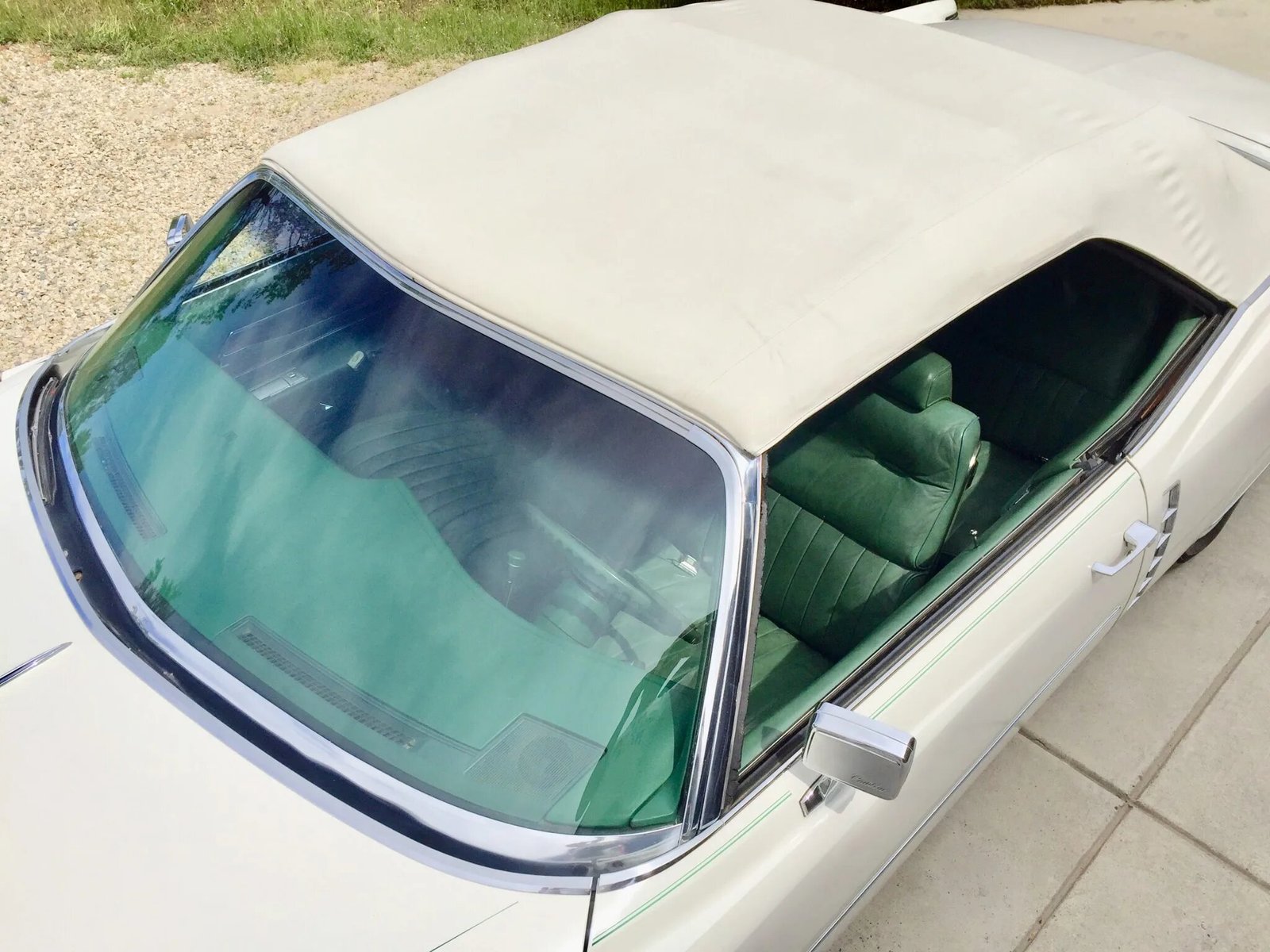 The car is powered by an 8.2-liter V8 paired with a three-speed automatic transmission and is finished in Cotillion White with a matching soft top over Dark Jade green leather upholstery.