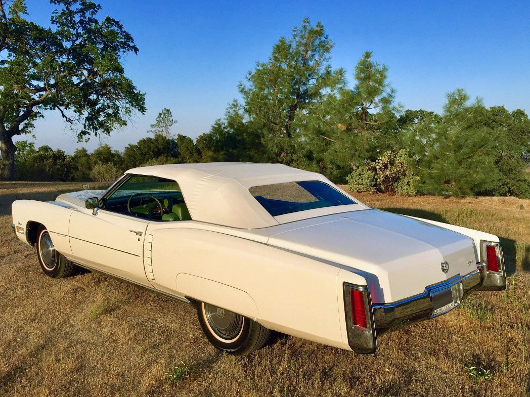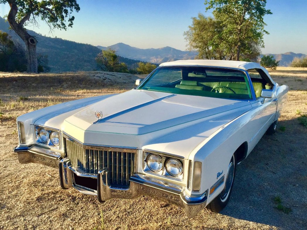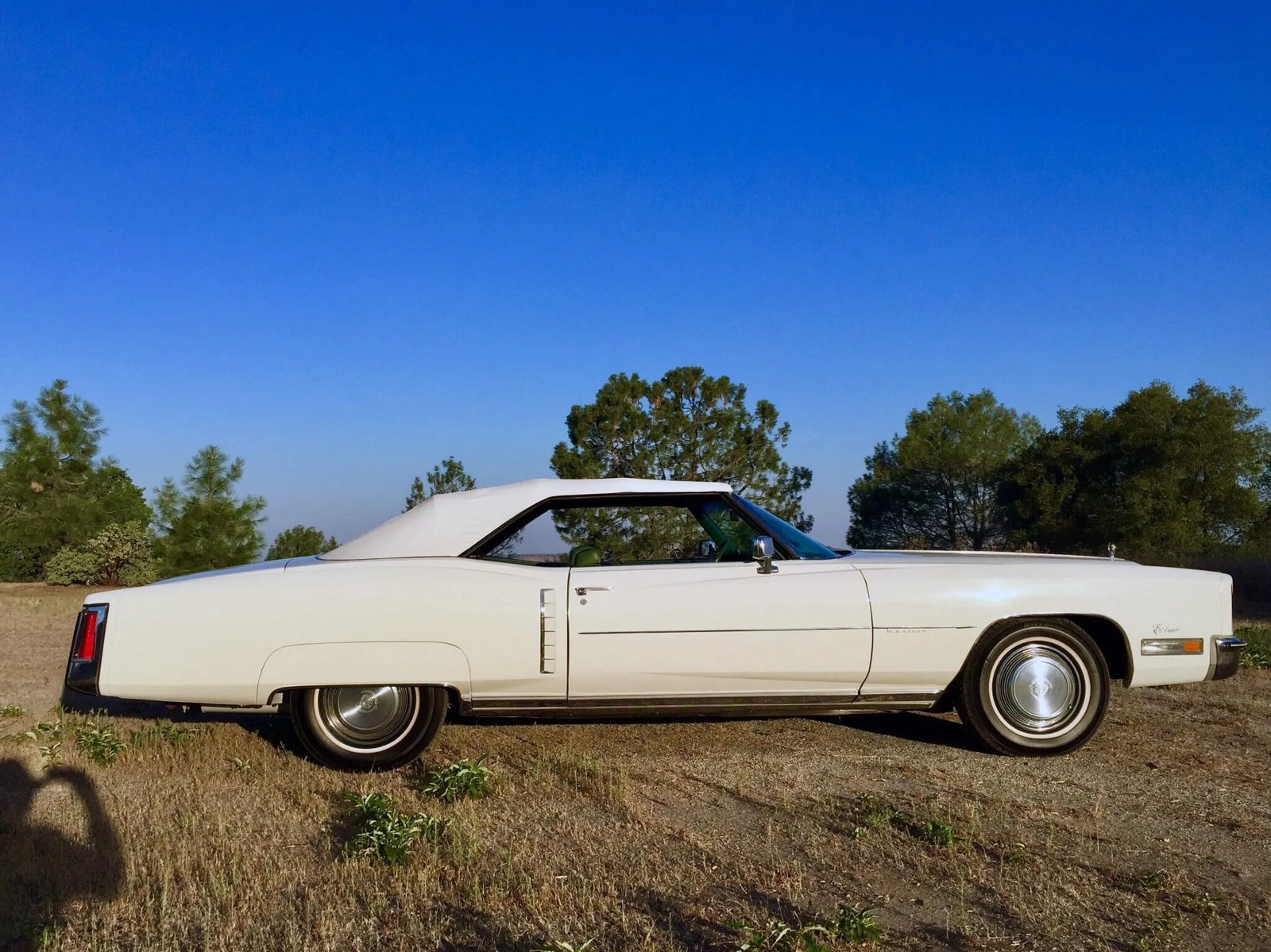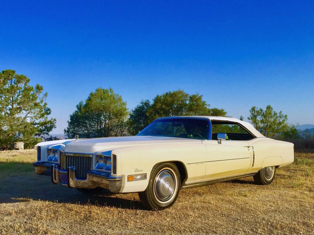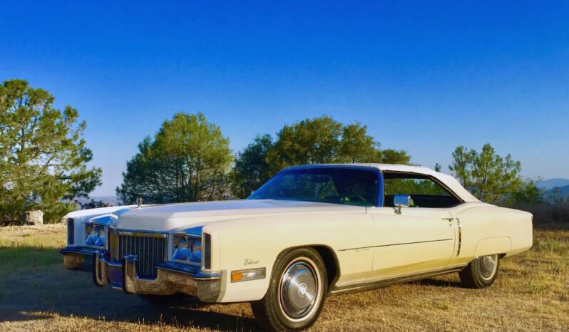 Features include a trumpet-style horn, Cadillac-logo floor mats, woodgrain accents, automatic climate control, twilight sentinel automatic headlights, Autronic Eye auto-dimming headlights, six-way power-adjustable front seats, power windows and door locks, a power trunk-lid release, a Cadillac-logo trunk mat, an analog clock, and an AM/FM stereo with a remote 8-track player.