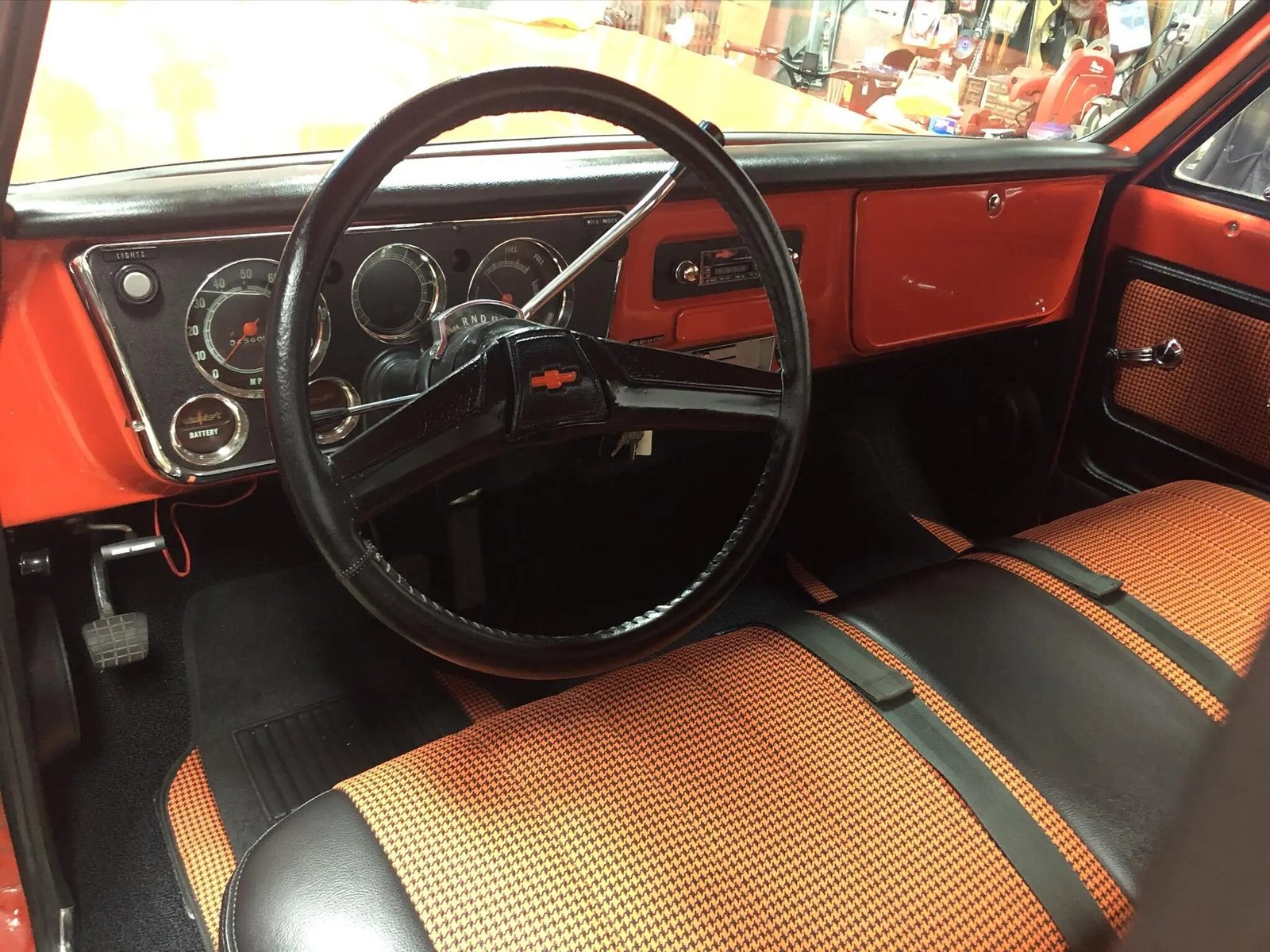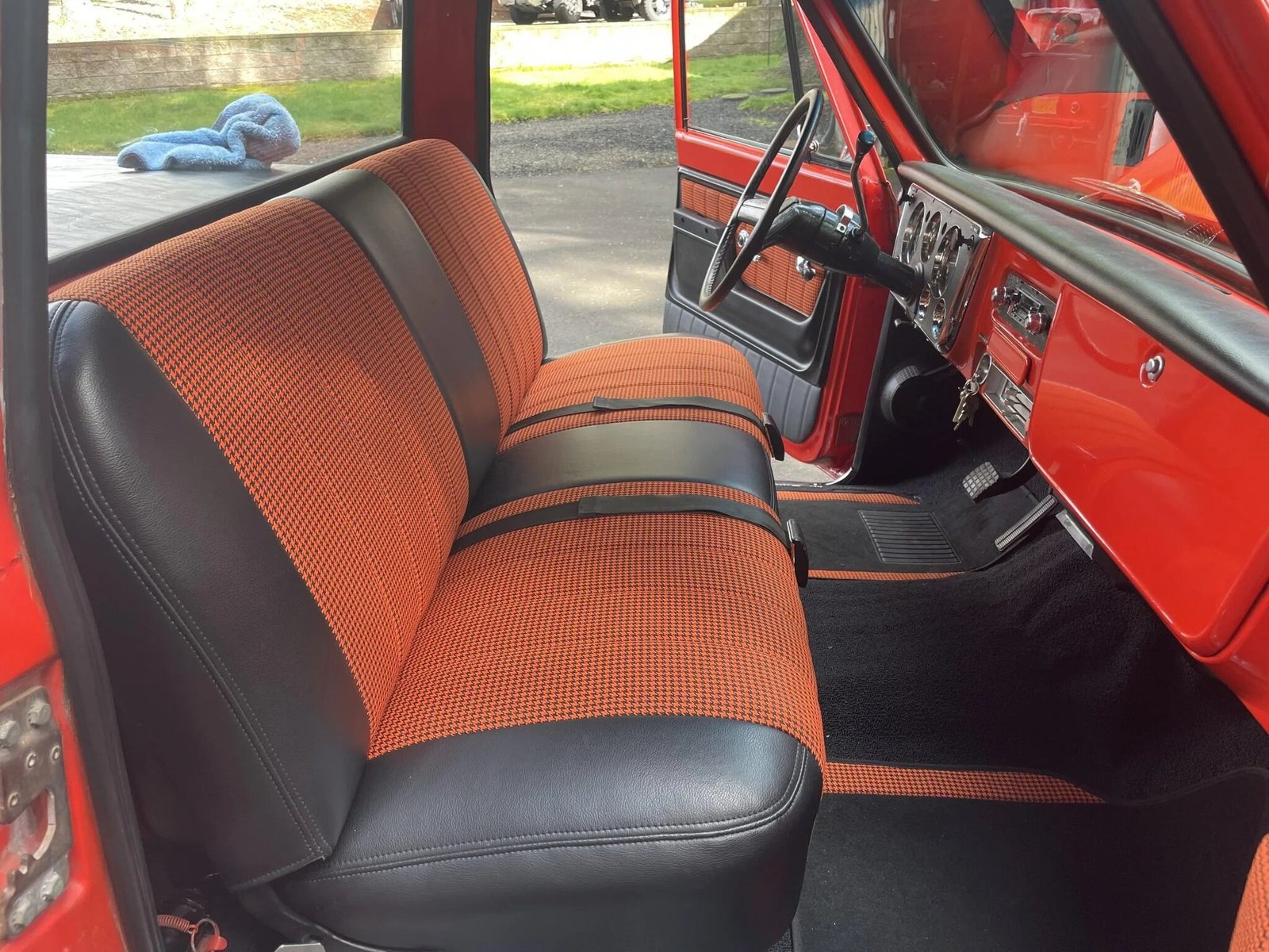 The bench seat, door panels, and sun visors are upholstered in black vinyl with orange houndstooth fabric inserts, and the floors are protected by black carpeting and matching floor mats.