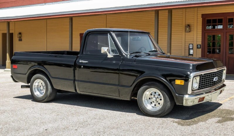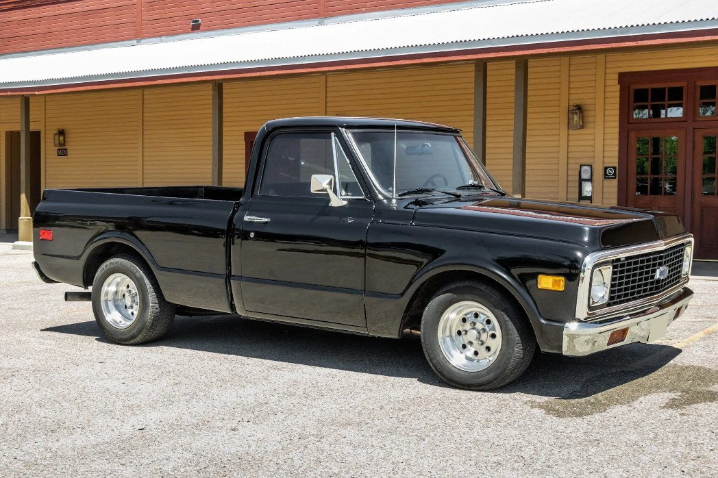 This 1972 Chevrolet C10 pickup is a short-bed standard-cab pickup finished in black over a black interior and powered by a 383ci V8 paired with a three-speed automatic transmission.