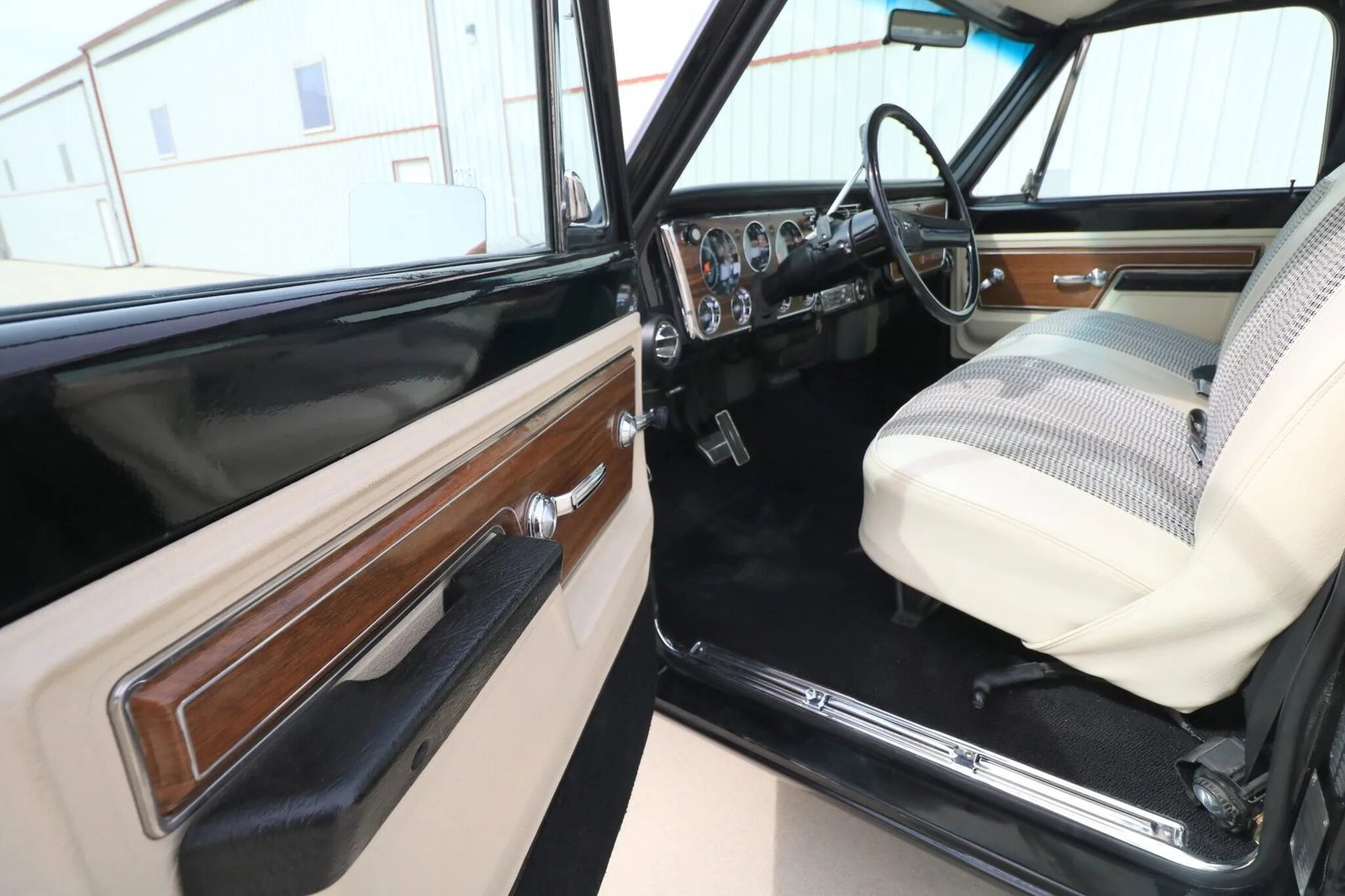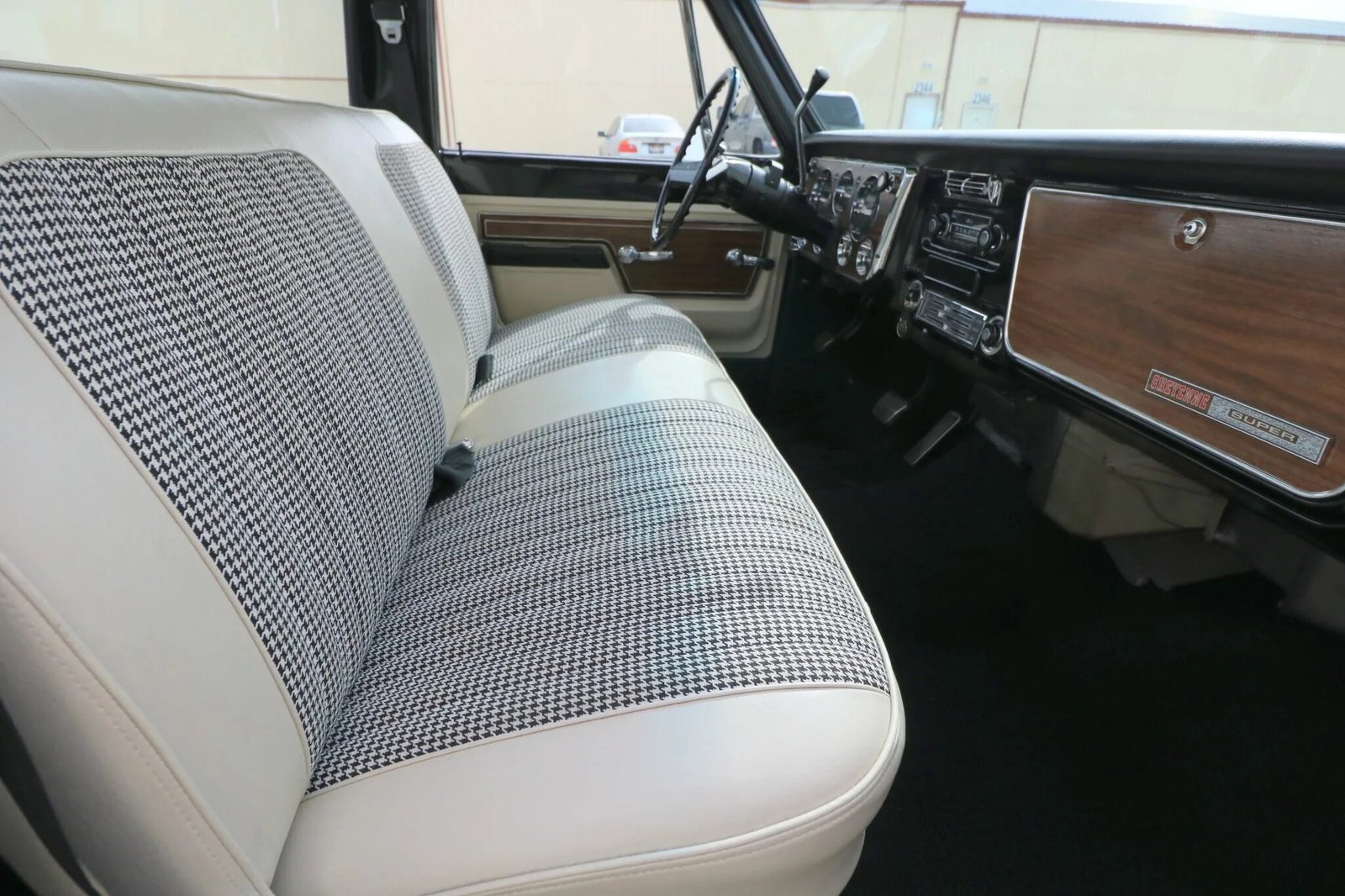 The cabin houses a bench seat that is trimmed in white vinyl with houndstooth fabric inserts along with a matching headliner and door panels, black carpeting, and woodgrain-look trim.