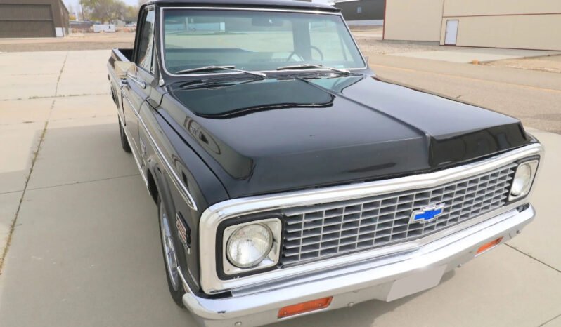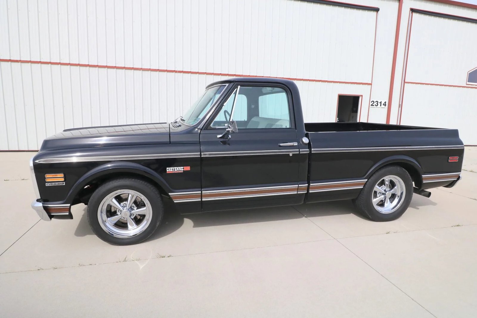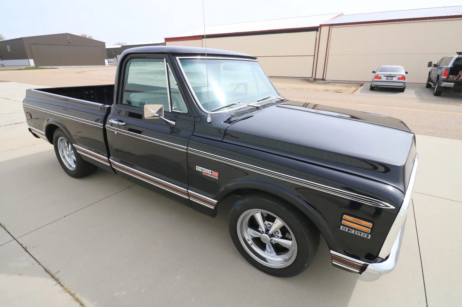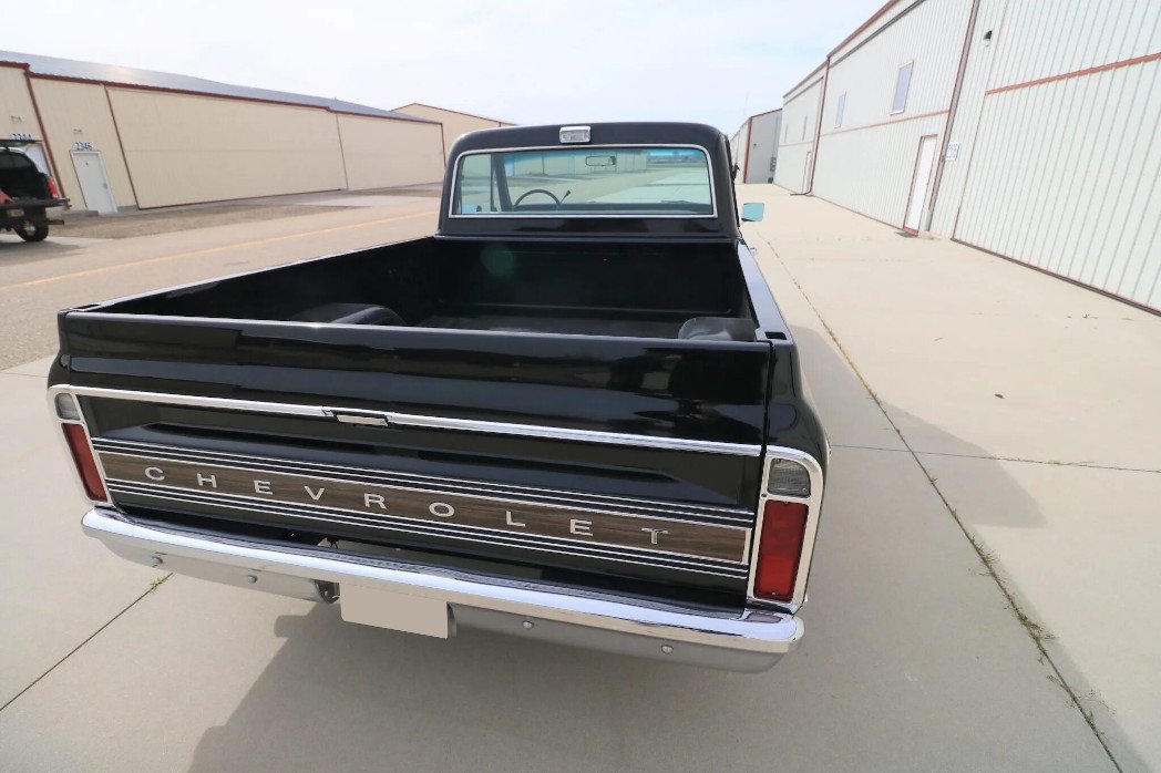 A single-stage repaint in black was carried out, the frame was refinished, and replacement Cheyenne Super badging and faux-woodgrain side moldings were installed.