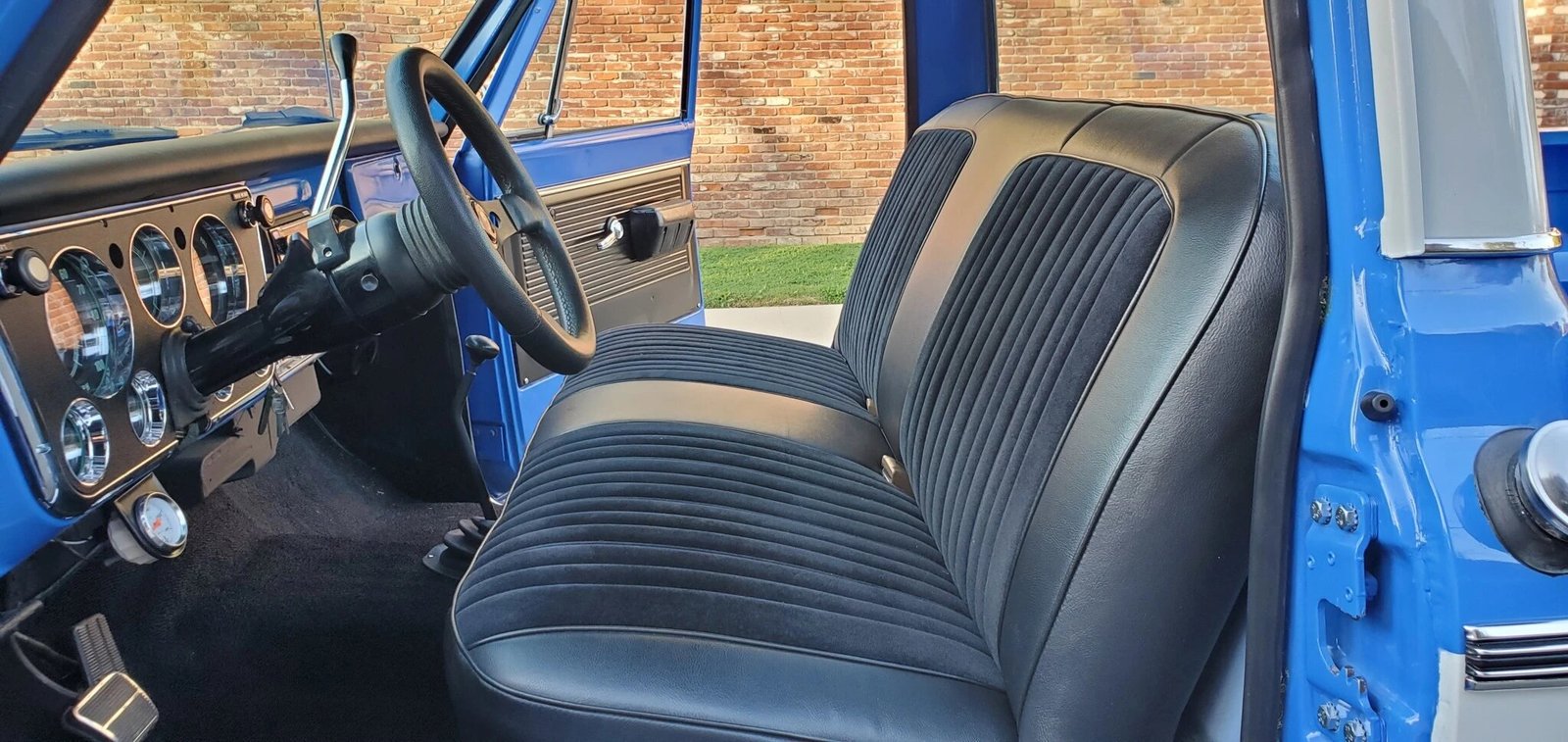 A black bench seat sits over black carpeting, and metal trim in the cabin is a body-matching blue.
