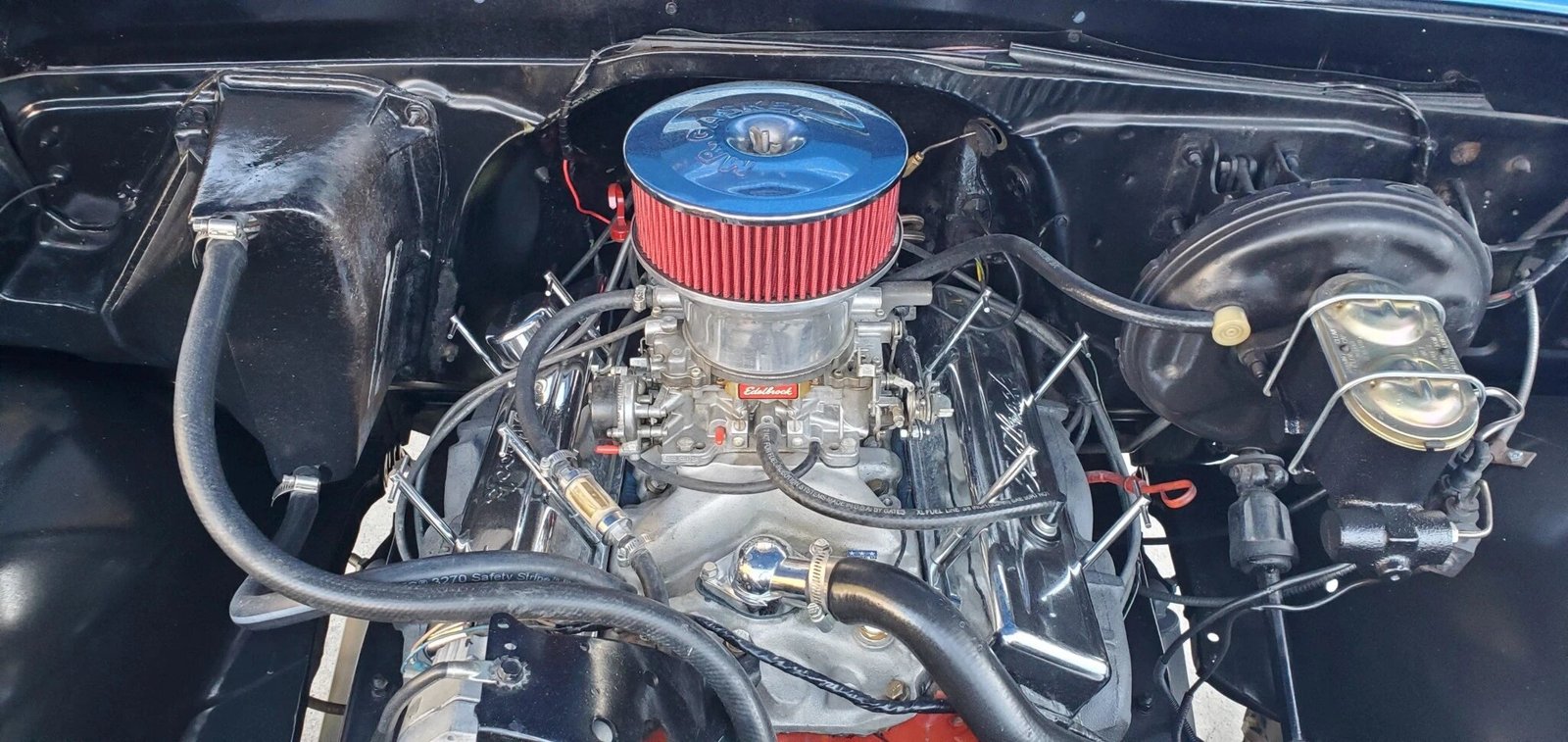 Aftermarket parts include an Edelbrock four-barrel carburetor, a high-rise intake manifold, chrome-finished valve covers, and a dual exhaust system that terminates ahead of the rear axle.