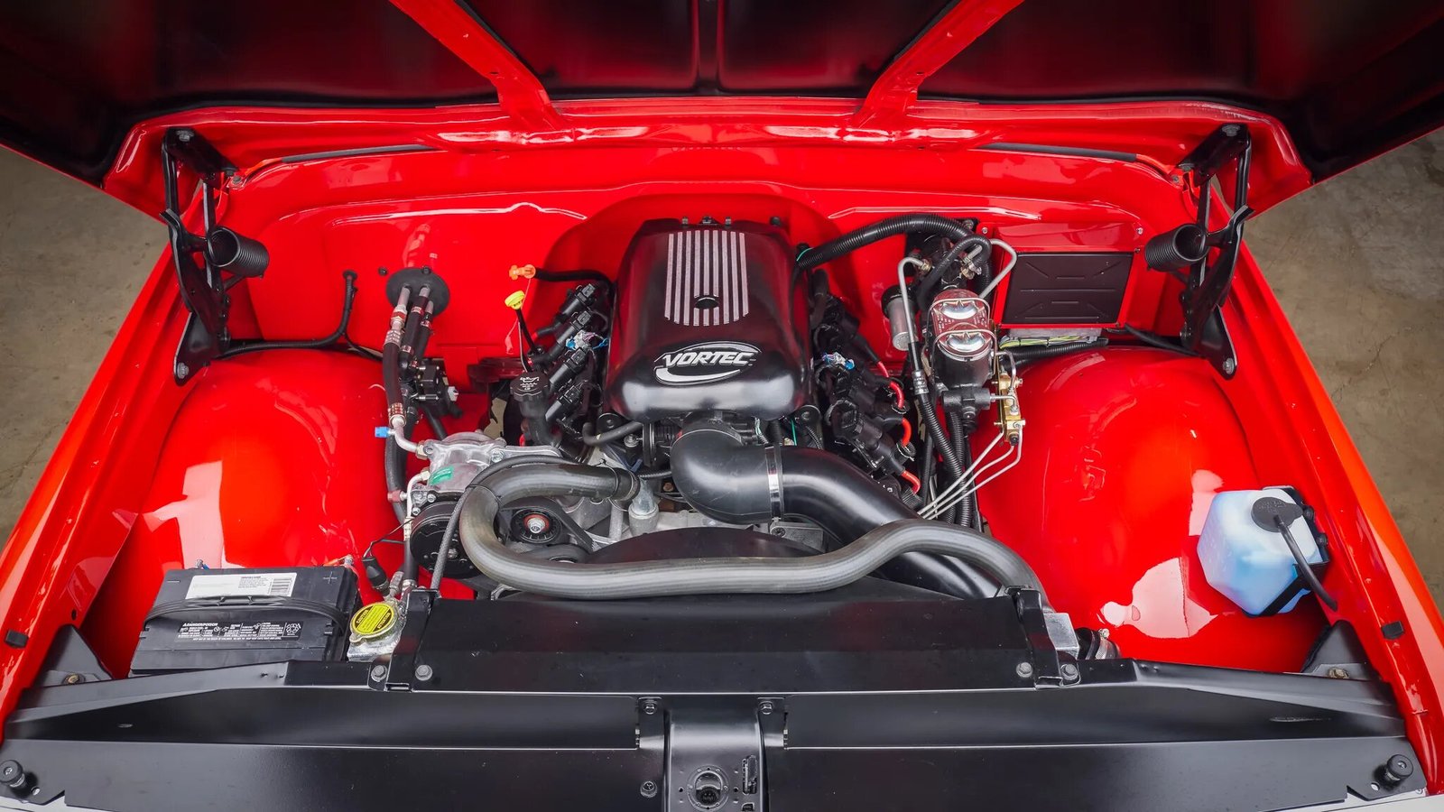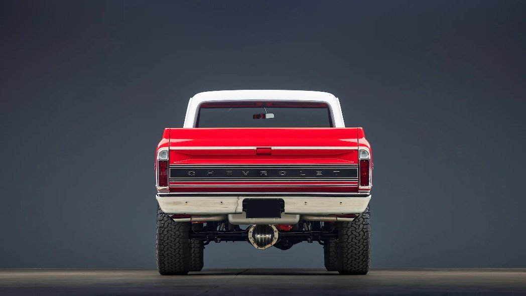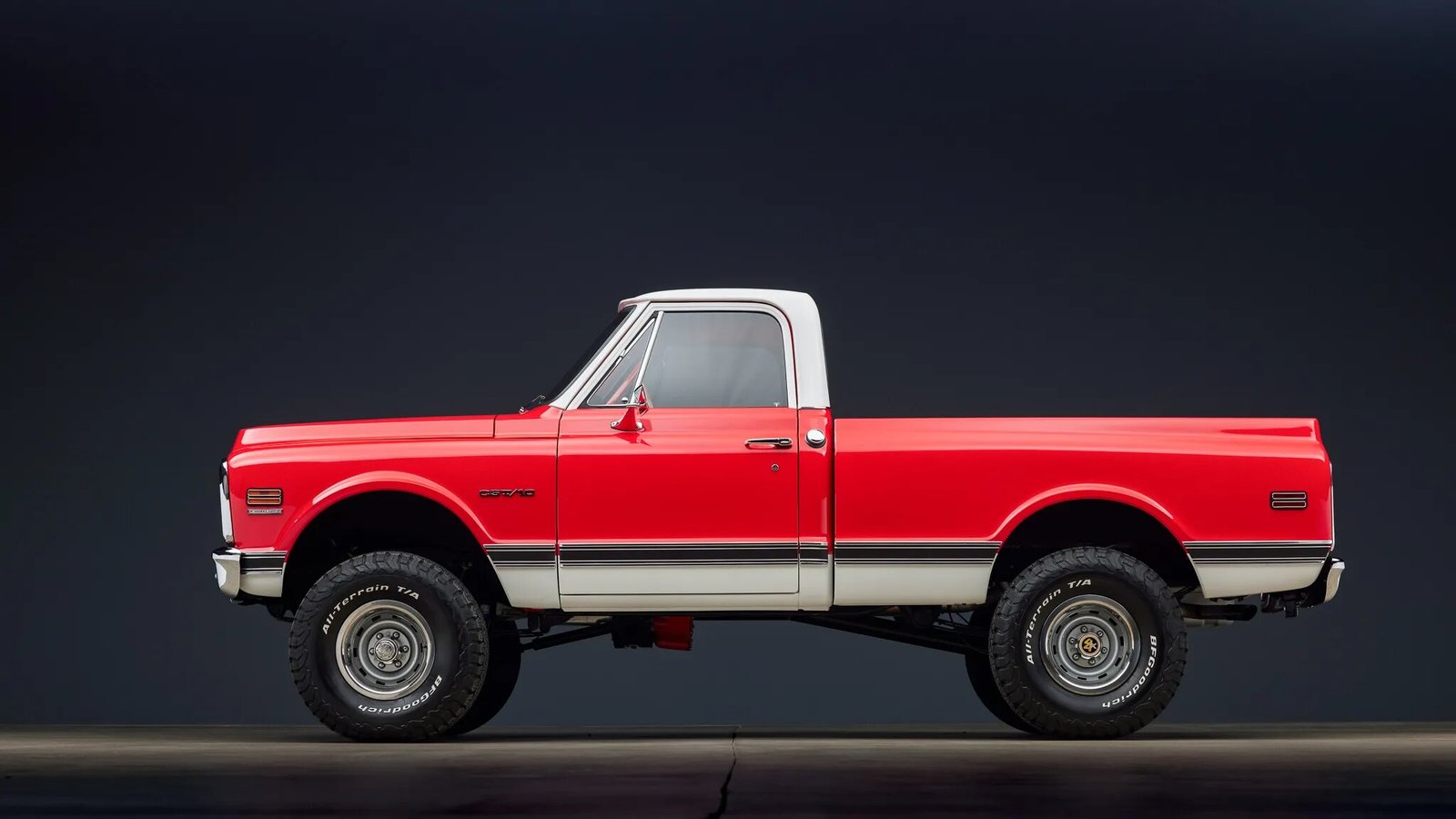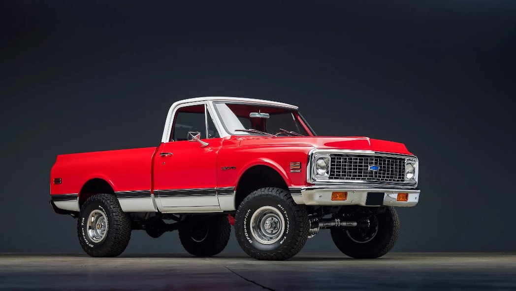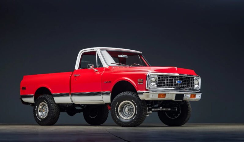 This 1972 Chevrolet C10 is a short-bed Fleetside pickup has been modified with a four-wheel-drive chassis and fitted with a 5.3L Vortec V8, a four-speed automatic transmission, and a dual-range transfer case. The truck is finished in two-tone red and white, and the interior features black vinyl TMI seats, houndstooth fabric door panel inserts, air conditioning, an Audison stereo system, Classic Instruments gauges, and an aftermarket wood-rimmed steering wheel. Additional equipment includes Rough Country shocks, power steering, front disc brakes, 15″ Rally wheels, an E-Stopp electronic parking brake kit, a dual exhaust system, and tubular headers.
